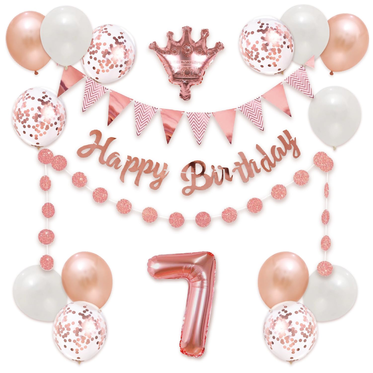【仕様】7歳用 女の子のお誕生日にぴったりのローズピンクのバースデー飾り付けセット! 手で持ってちょうど良い程よいサイズの数字バルーンがかわいいセットです?