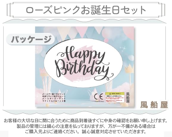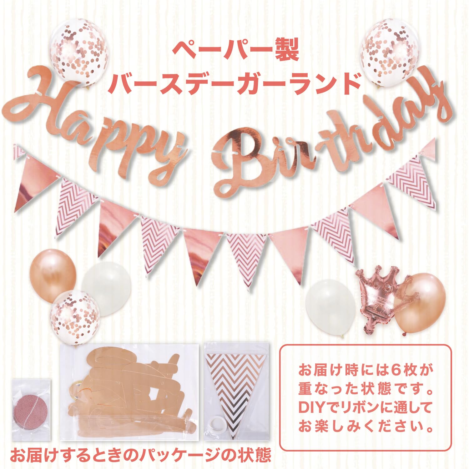 【内容】Happy Birthdayガーランド、数字バルーン手持ちサイズ、クラウンバルーン、ドットガーランド、トライアングルガーランド、ラテックスバルーン(ローズピンク)5枚、ラテックスバルーン(コンフェティ)5枚、ラテックスバルーン(ホワイト)5枚、リボン・ストロー