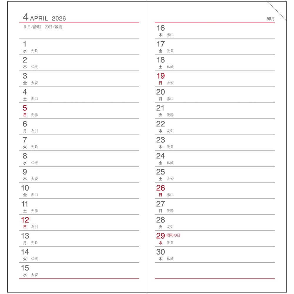 連続する予定が書きやすく、一覧しやすい横罫タイプの月間予定表。薄くて軽いのでスーツの内ポケットにも入るサイズ。ノートサイズのダイアリーとの併用もおすすめです。