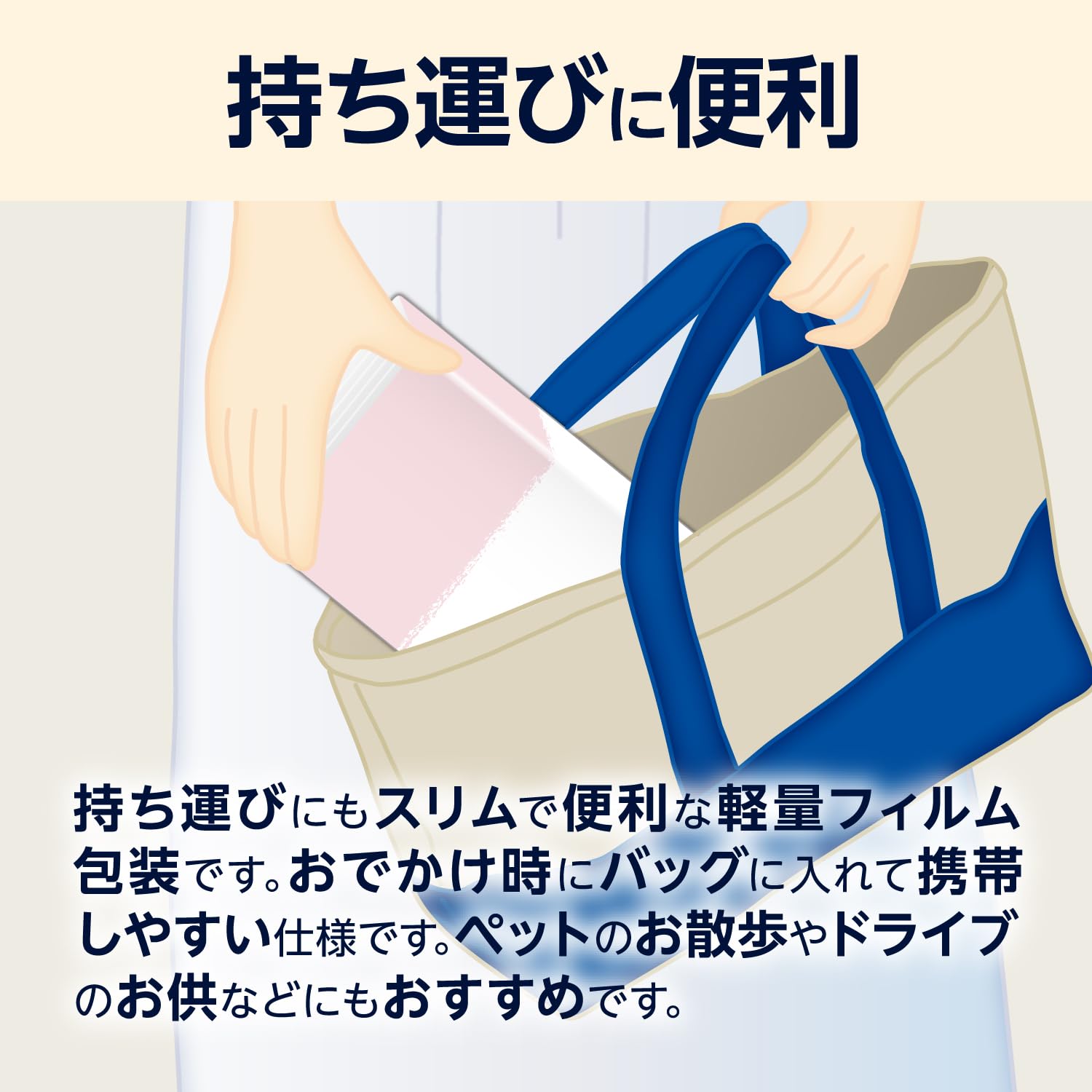 ●フィルム包装のため、アウトドアや水の近くでのご利用、ペットの散歩や車への常備など、用途が広がります。