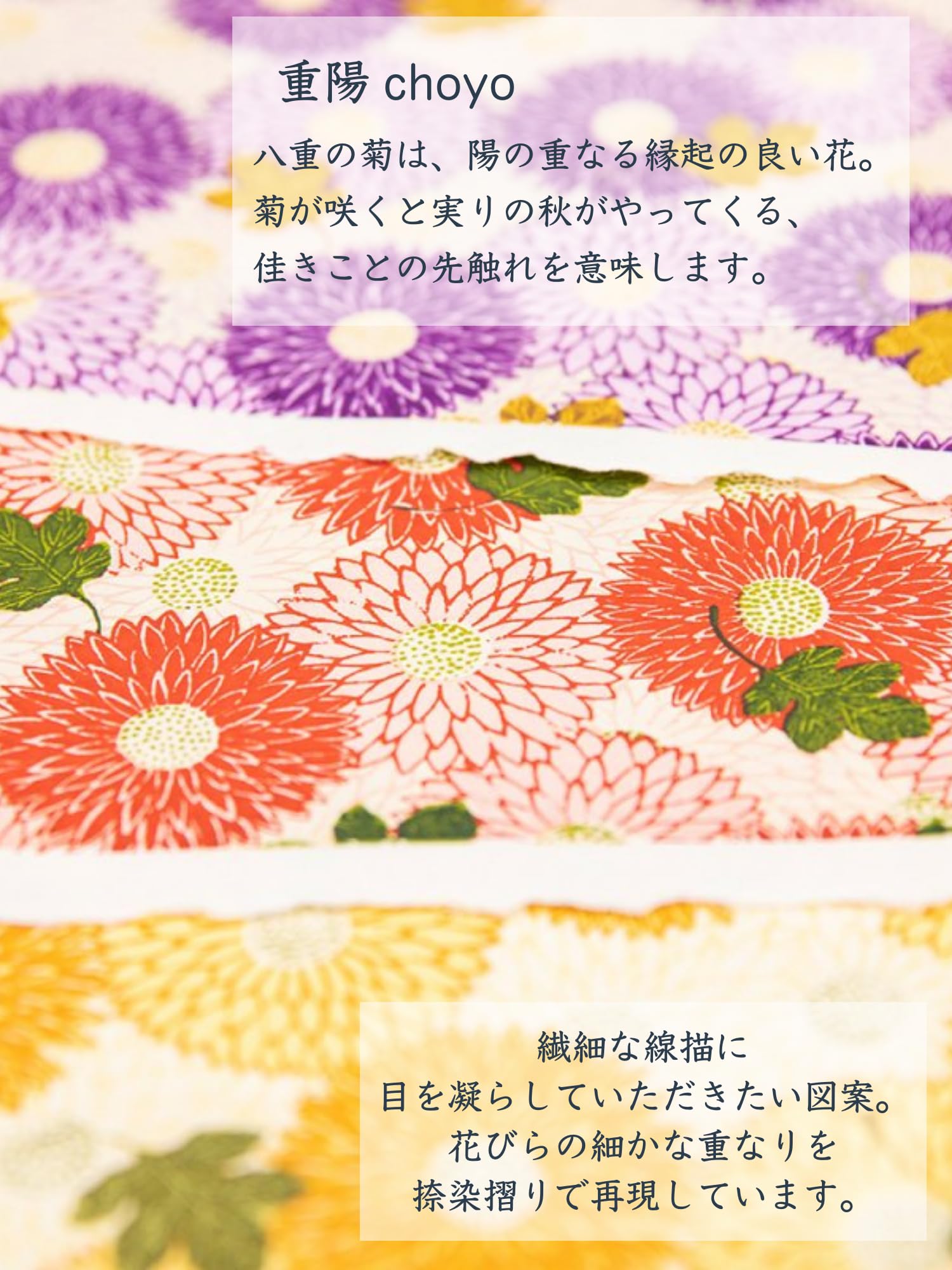 八重の菊は、陽の重なる縁起の良い花。 菊が咲くと実りの秋がやってくる、佳きことの先触れを意味します。 繊細な線描に目を凝らしていただきたい図案。 花びらの細かな色合いを木版刷りで再現しています。