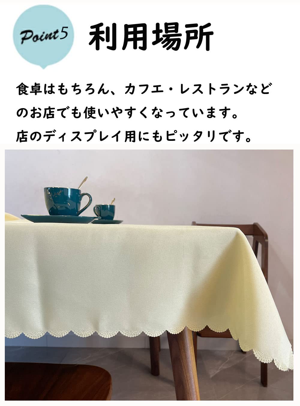 【速乾性に優れた生【4人掛けテーブルクロス】裾はスカラップ仕上げで可愛らしい雰囲気になっています。サイズは140×180cmで4人掛けテーブルにオススメ。地】もし汚してしまっても乾きが早いので気軽にお洗濯できるのが嬉しいポイント!ポリエステル生地だから型崩れしにくく、そして洗ってもシワになりにくく、アイロンの手間も省けます。