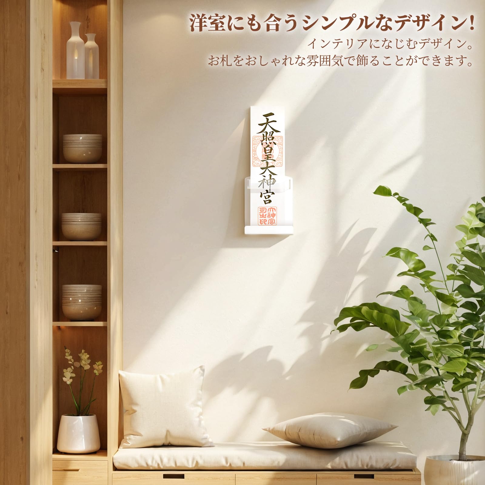 【モダンデザインの神棚】和室・洋室問わず使えるデザインのモダン神棚です。御札・神具セットに限らず、御朱印帳や御守りなどを安置することもできます。お札は木札も祀ることができる幅が十分にあります。