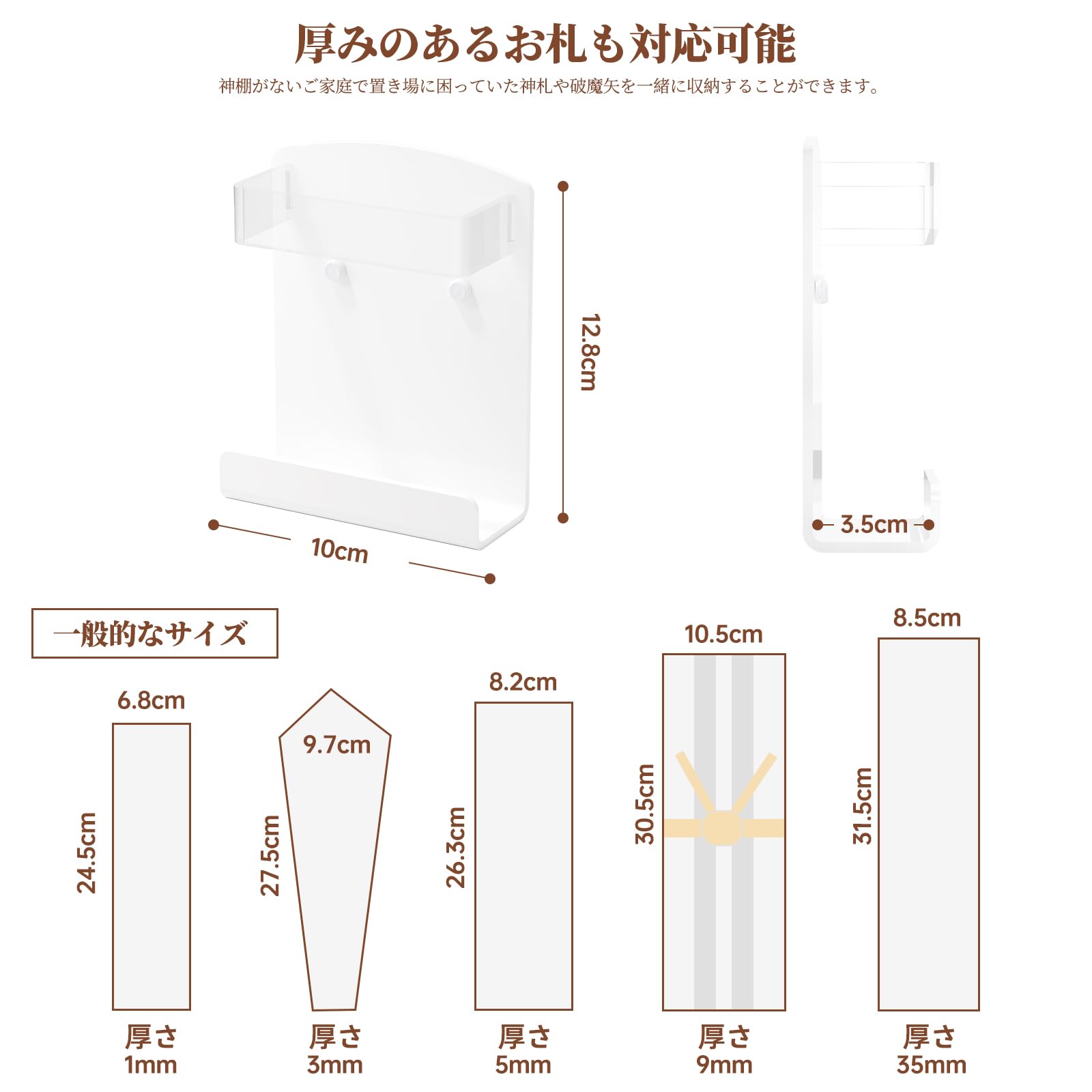 【設置可能な場所】木ネジで取り付け可能は壁:柱・かもい・板壁・プリント合板。石こうボード用プッシュピンで取り付け可能な壁:壁紙・布壁紙・ビニール壁紙貼りなどの石こうボード。寸法:長さ10×幅4×高さ12.8cm、内寸8.5×3.5cm。付属品は3本の石こうボード用プッシュピンと3本の木ネジです(神棚写真にイメージでお祀りの御札や御朱印帳などの付属はありません。)