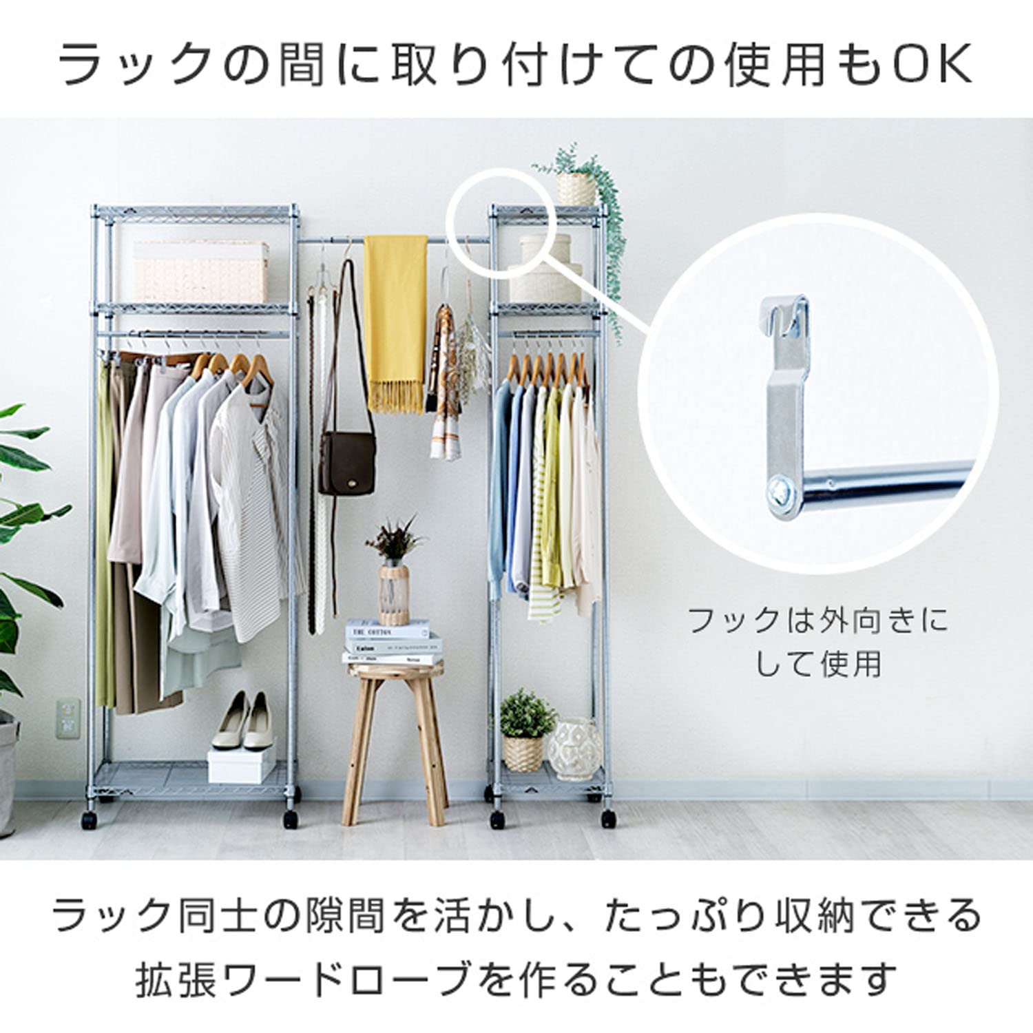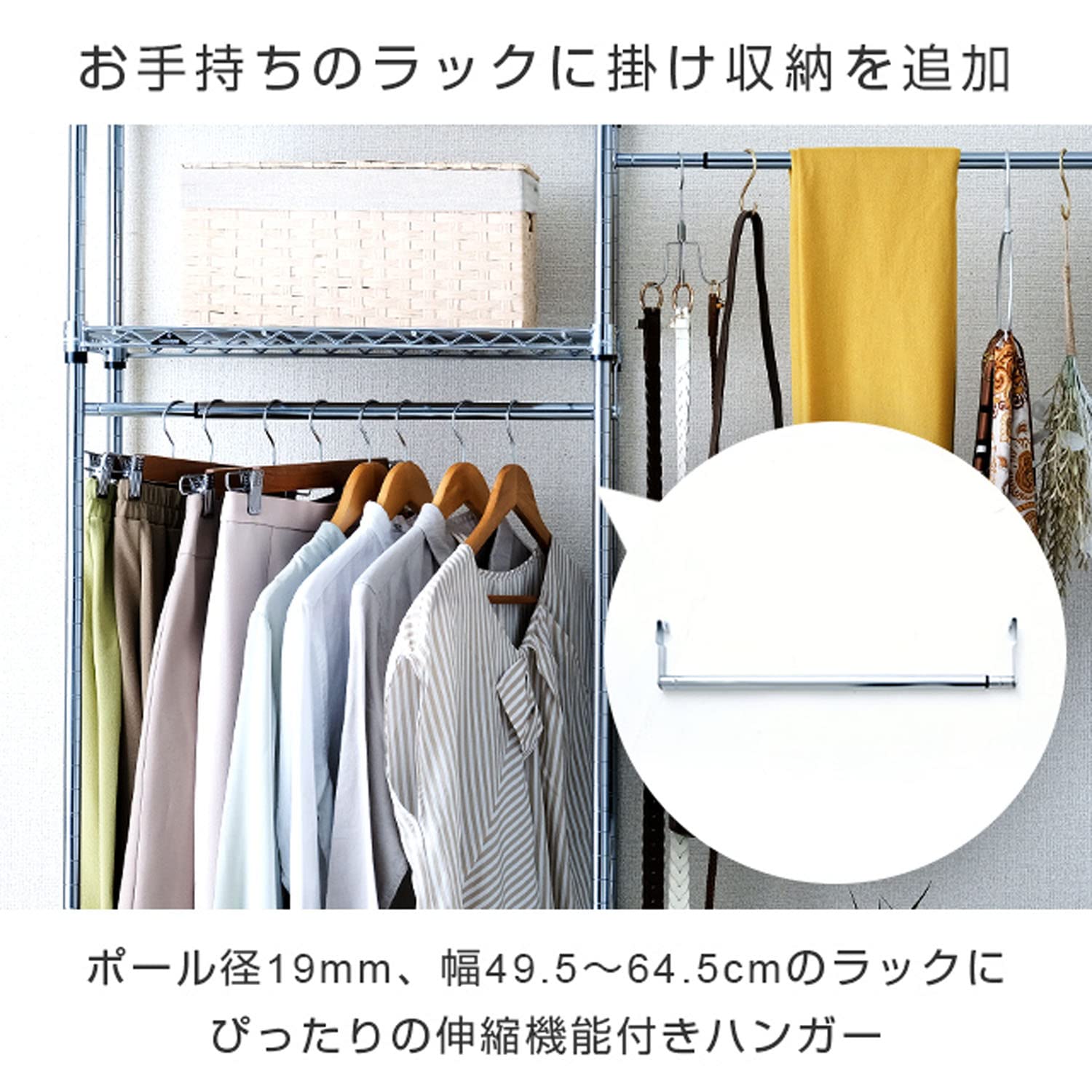 シェルフに取り付けることでラックをワードローブとしてご使用できます。伸縮タイプなので幅30〜45cmの棚に適応できます。ルミナスポール径19mm専用パーツになります。