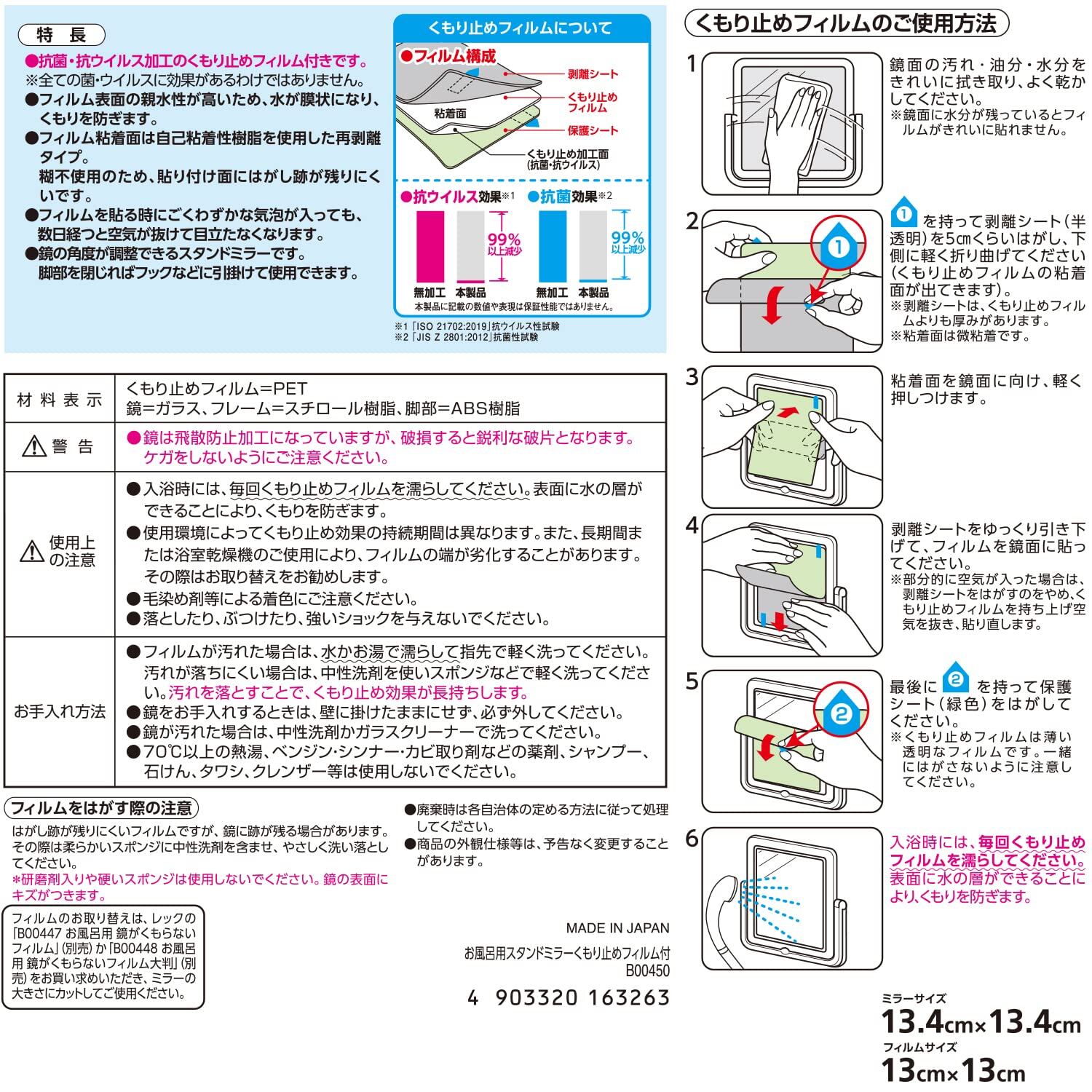 レック(LEC) お風呂用スタンドミラー 鏡サイズ:13.4×13.4cm くもり止めフィルム付 B00450