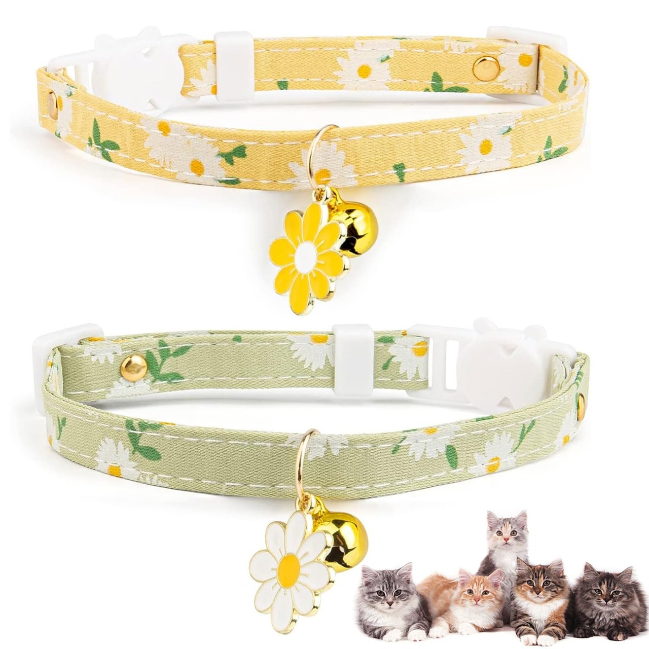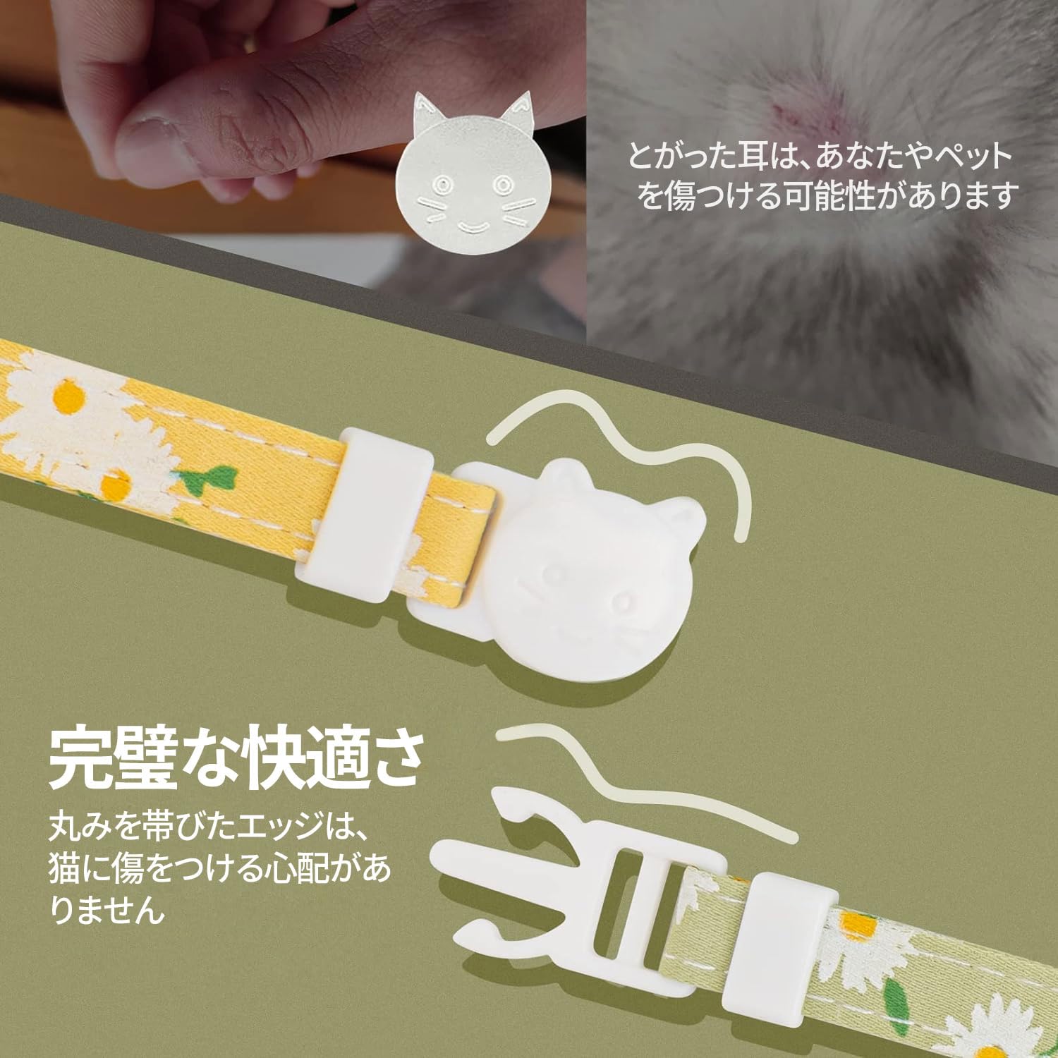 猫 首輪 2個セット 猫 首輪 セーフティバックル 鈴付き デイジー柄 安全留め具 かわいいネックレス 猫の首輪 小動物 小型犬用 超軽量 S 安全 調節可能 ポリエステル綿