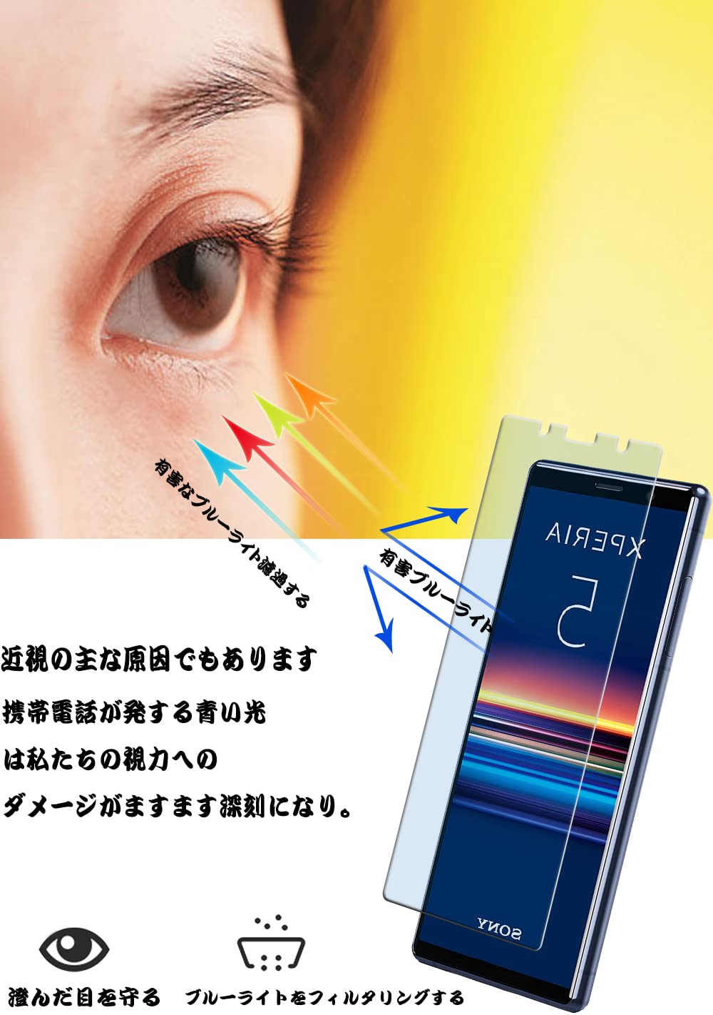 【ブルーライトカット 93%】【目の疲れ軽減】Xperia 5 用の ガラスフィルム SO-01M/SOV41 用の 液晶保護 フィルム 保護ガラス レンズ保護フィルム