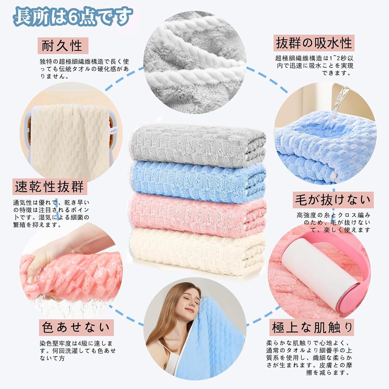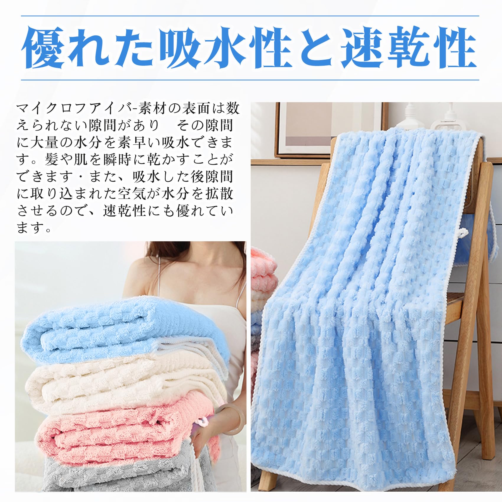 【優れた吸水性、速乾性】綿素材より優れた吸水性と速乾性。 マイクロファイバー素材の表面には無数の隙間があり、その隙間に大量の水を素早く吸収します。 髪や肌を軽く拭くだけで水分を吸収し、ホコリがつきにくいです。 バスタオルの隙間により、隙間に溜まった水分を空気が素早く拡散させるので、乾燥が早く。抗菌・防臭効果もあります、湿気によるカビや細菌の繁殖を抑えます。