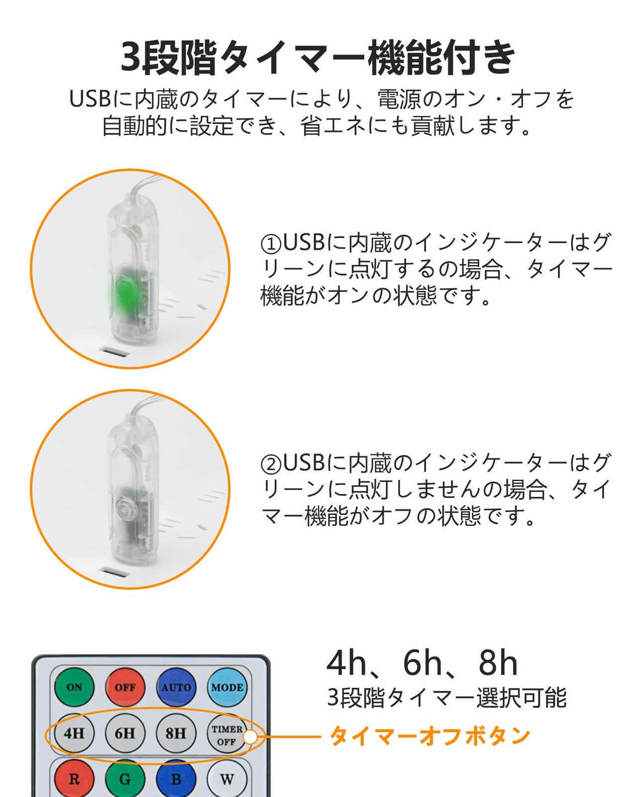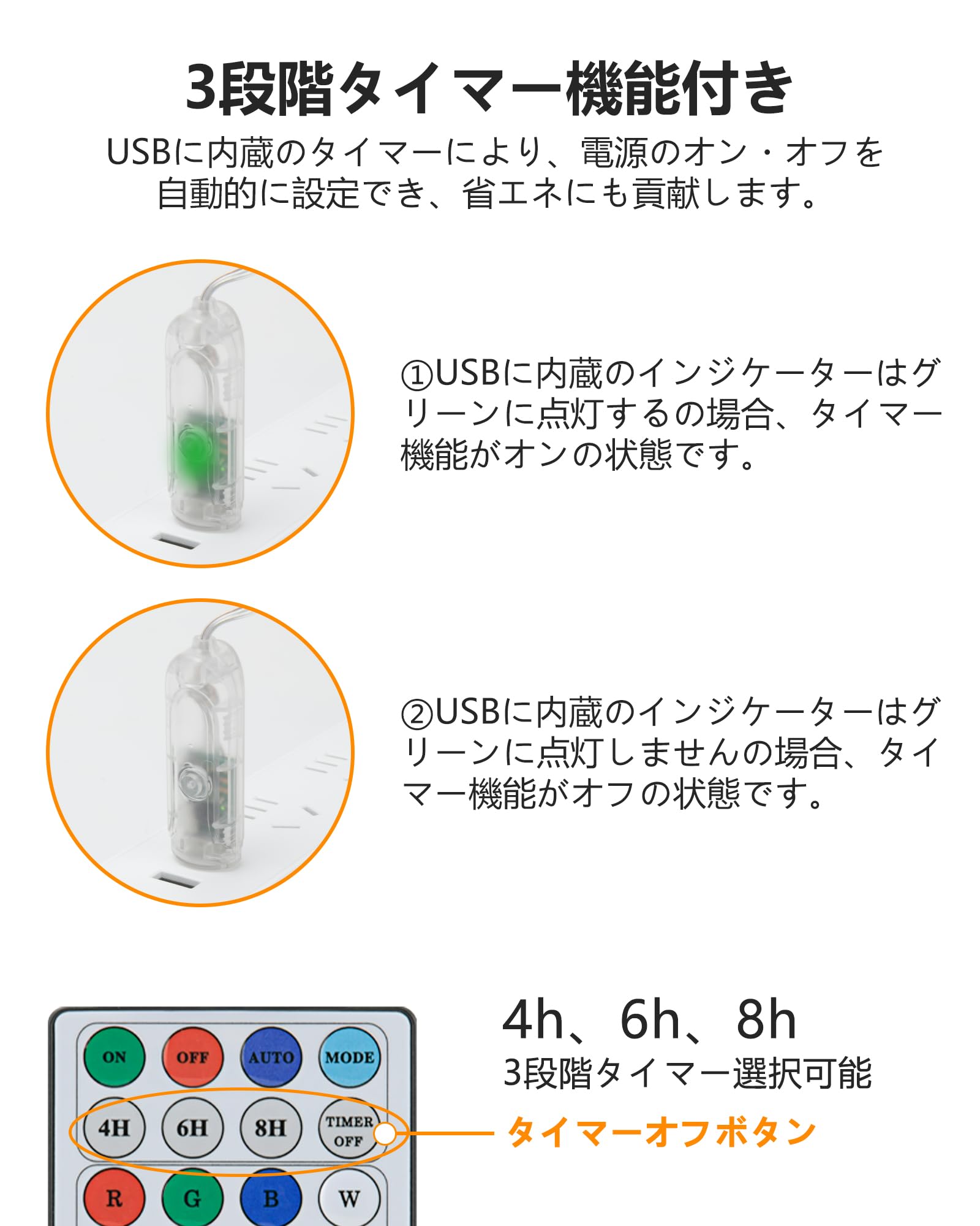 ?【3段階タイマー機能・省電力】毎年のクリスマス飾りライトとして、このイルミネーションライトはタイマー機能も装備しております。リモコン操作により、4h、6h、8hの3段階タイマーが選択でき、おニーズに合わせて設定すれば、例えば4時間点灯して、その後自動消灯します。20時間後自動点灯して、4時間自動消灯します。電源をオフしなければ、その繰り替えが続いています。それで、使わない時に消灯を忘れても自動消灯でき、電気の無駄遣いを避けられ、使い勝手が非常に良いのクリスマスツリーライトです。