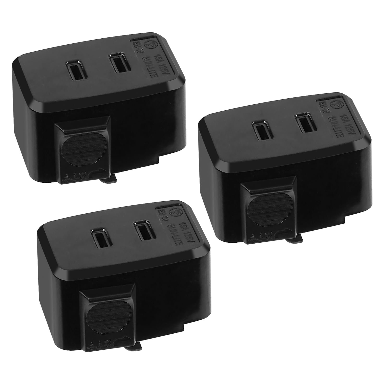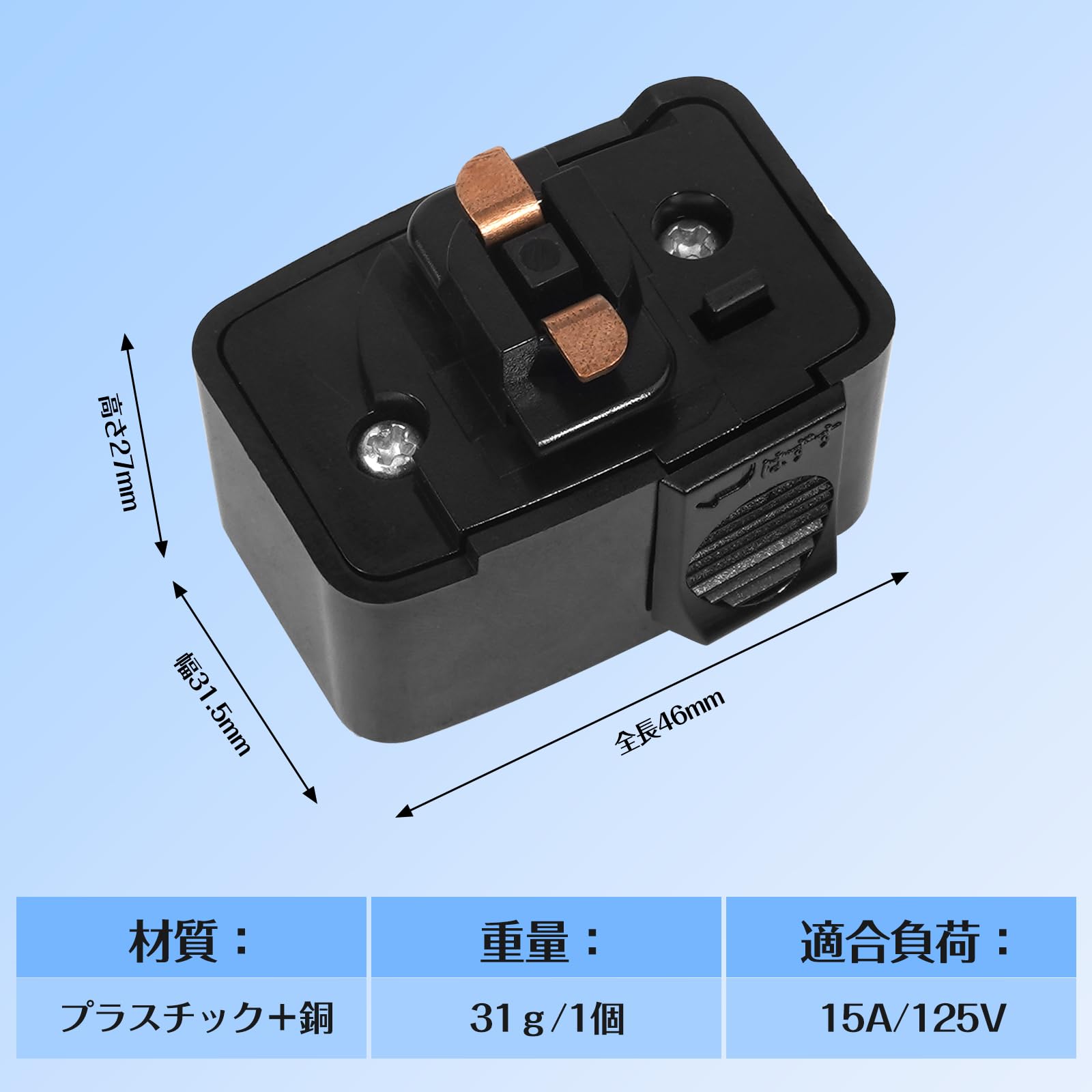 1. レール用 プラグ 包装:3個入り、色: 黒い、サイズ:高さ27mm×幅31.5mm×全長46mm、材質:プラスチック+銅、重量:31g/1個、適合負荷: 15A/125Vまで。