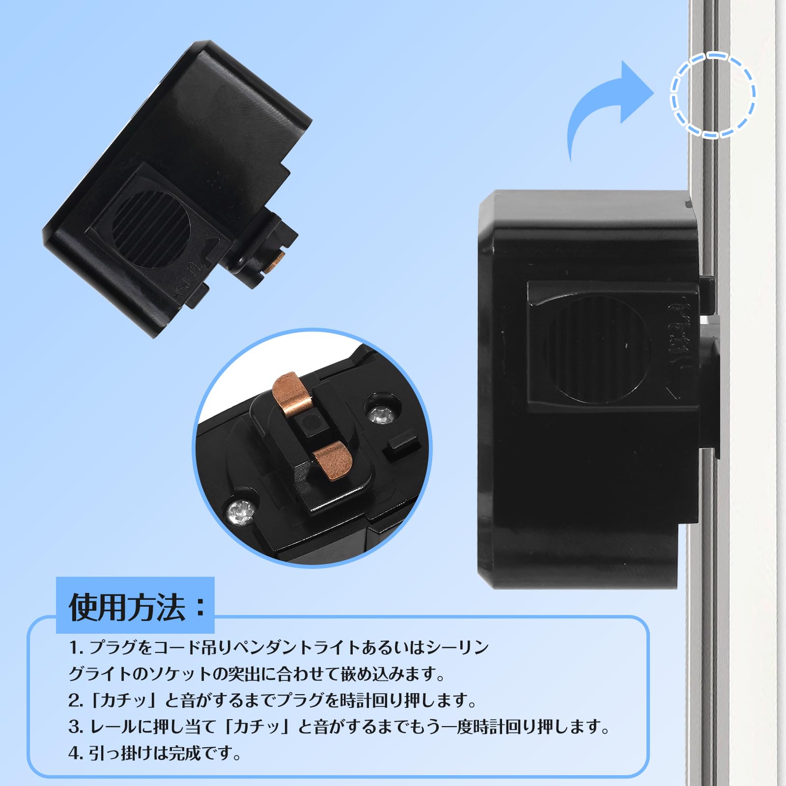 5. 応用:ライティングレールに取り付けて使用する引掛けシーリングプラグです。コード吊りペンダントライトやシーリングライトをライティングバーに装着する場合に適用します。