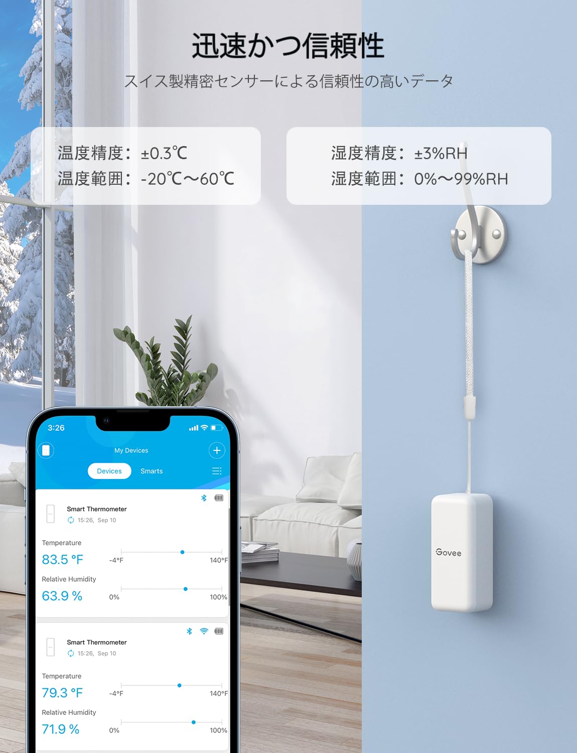 【高精度な温湿度測定】Govee WIFI温湿度計はスイス製SHT30センサーを内蔵し、温度は最大±0.3°C、湿度は最大±3%RHの誤差に抑えられます。また、データは2秒ごとに更新し、より高精度な温度や湿度を管理できます。製品は-20℃〜60℃で正常に動作します。冷蔵庫などの環境に置かないでください。損傷により接続できなくなる恐れがあります。