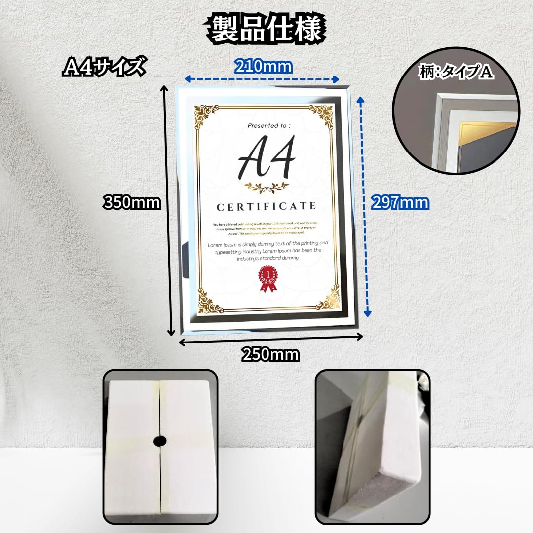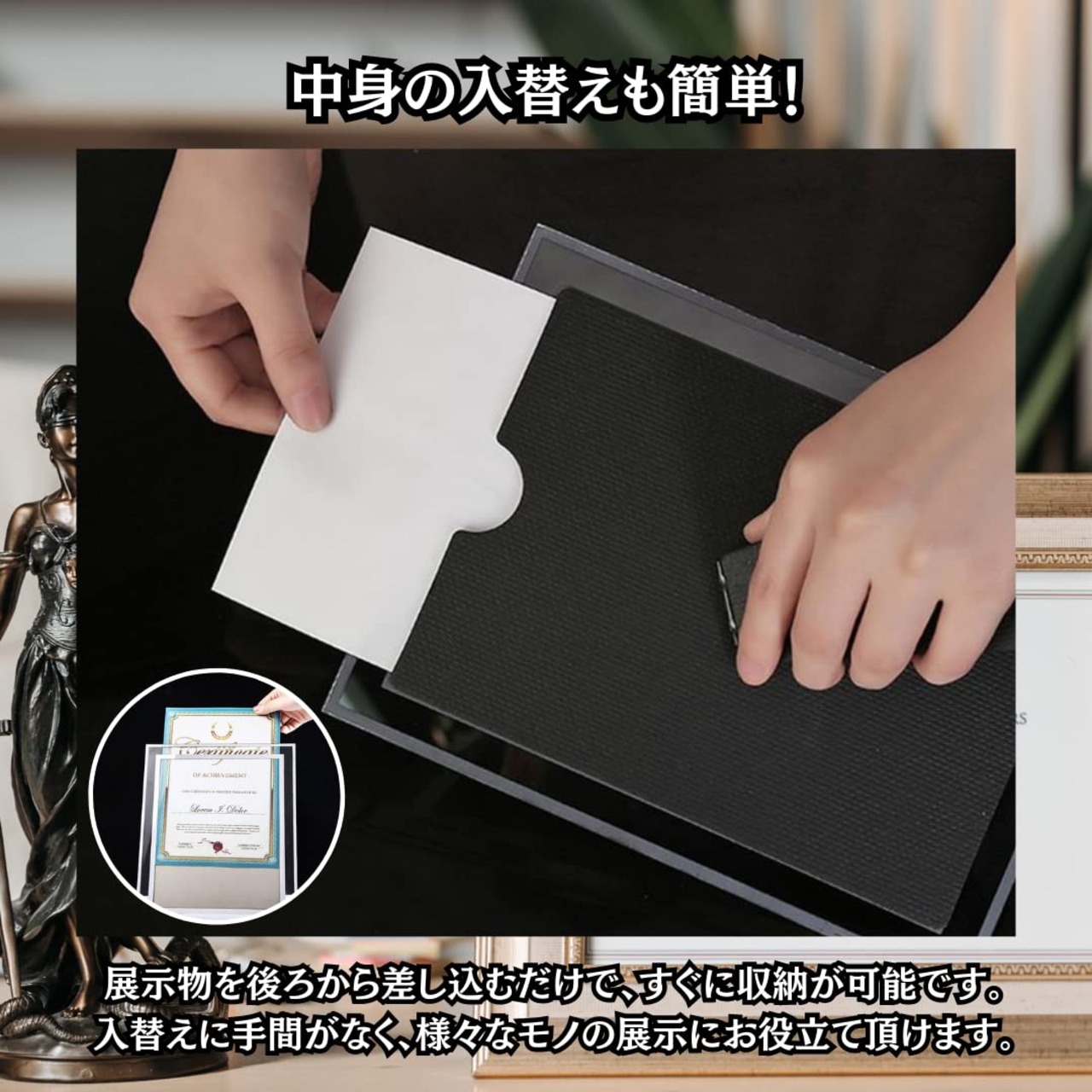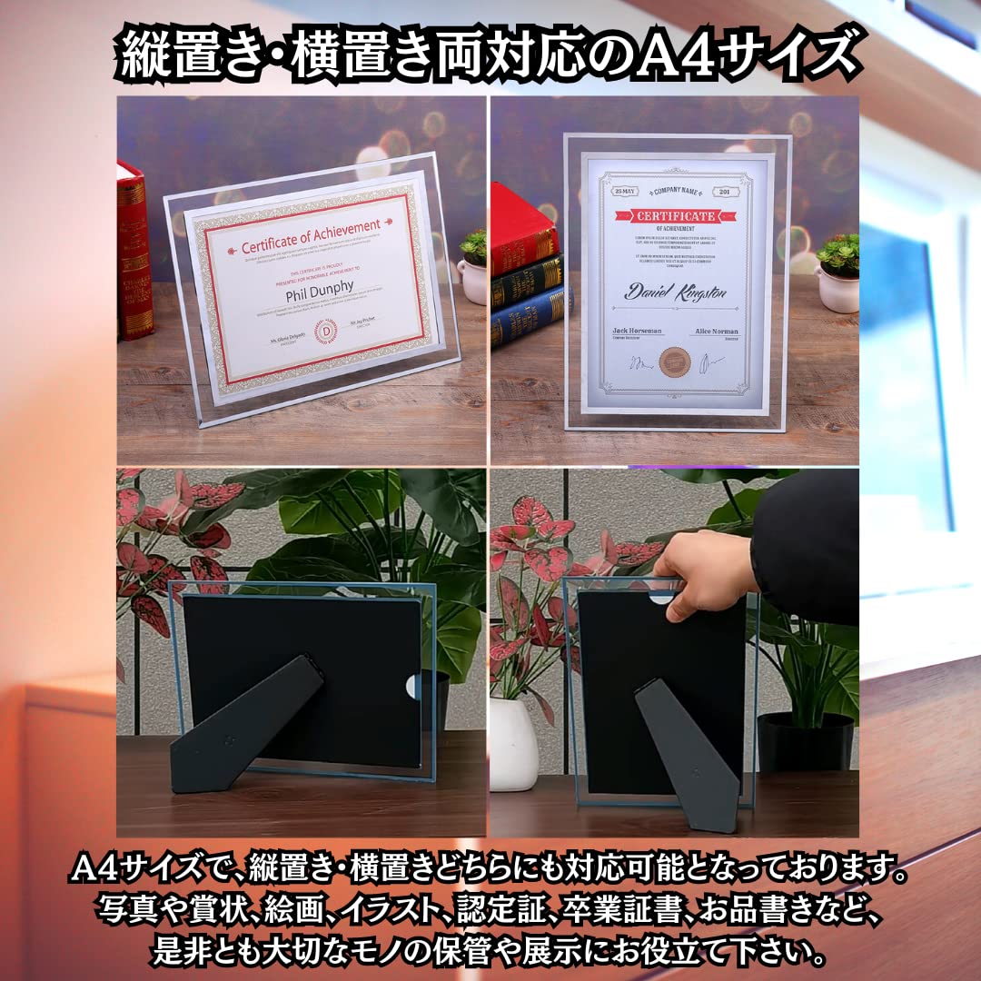 【縦置き・横置き両対応のA4サイズ】縦置き・横置きどちらにも対応可能な、使い勝手の良いA4サイズとなっております。展示物を後ろから差し込むだけで使用できるため、入れ替えも簡単!大きめの写真や証書、賞状、表彰状、ポスター、感謝状、絵画、イラスト、許可証、認定証、免許証、卒業証書など、是非とも大切なモノの保管や展示にお役立て下さい。