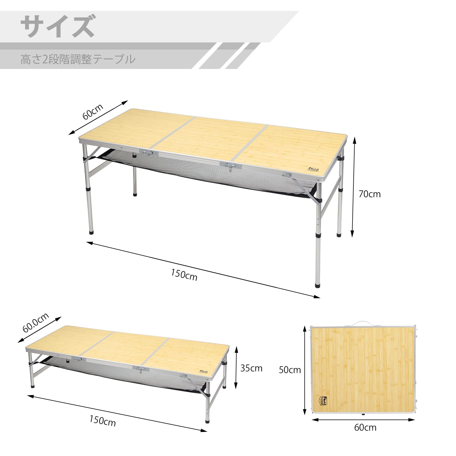 【素材】:支柱部分材質:アルミニウム、天板材質:メラミン加工合板 /サイズ:使用時:約150×60×高さ70/37cm、収納時:約50×60cm /本体重量 : 6.02kg /耐荷重:(約)50kg、均一な耐荷重で100kgまで対応可能。