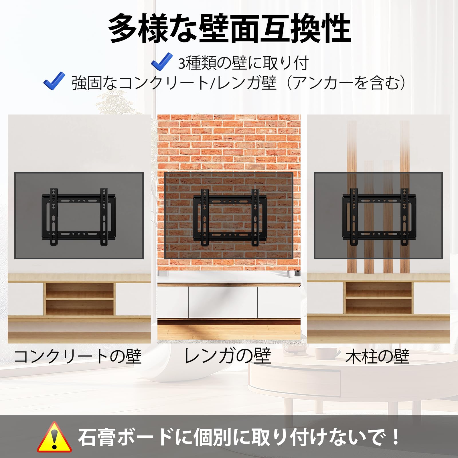 【/壁掛け用テレビ金具】本金具は冷間圧延鋼素材の一体型作りで丈夫で使用寿命が長いです,変形ありません。表面はピアノ塗装したので、滑り止め、錆もつきません。最大耐荷重は25kgで、テレビが倒れる心配がなく安心です。耐震性もあります。