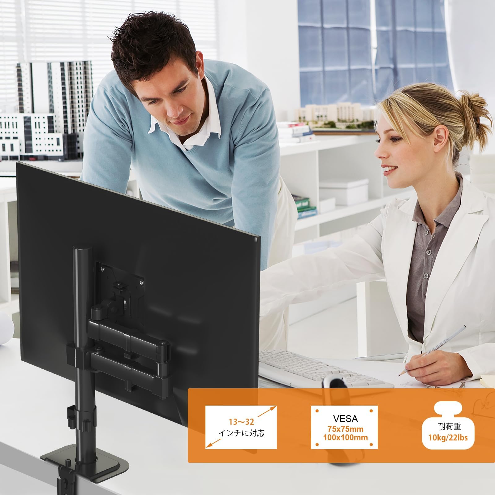 【対応モニター】液晶モニターを1画面設置できるディスプレイアームです。耐荷重は10KGで、VESA規格は75×75mm/100×100mmで、13~32インチPCモニターに対応します。