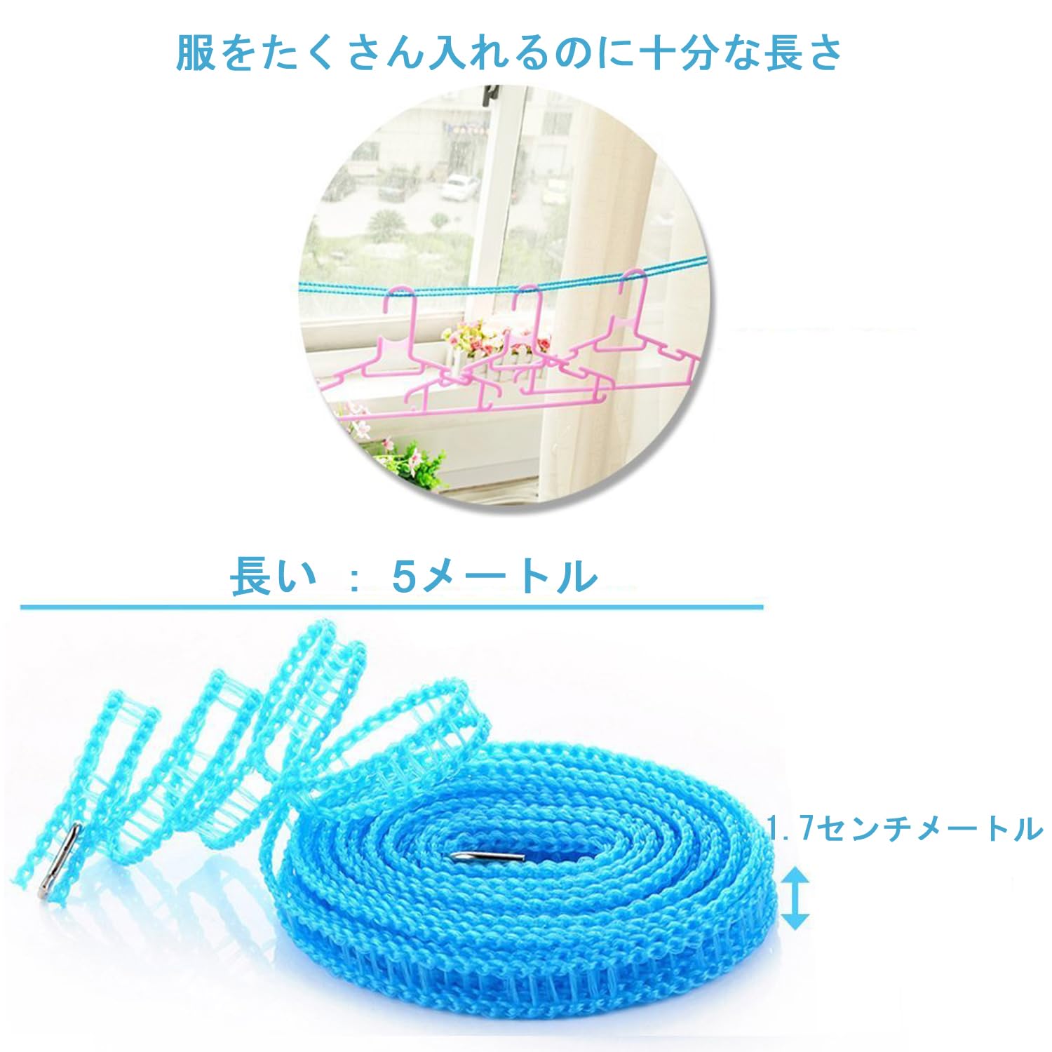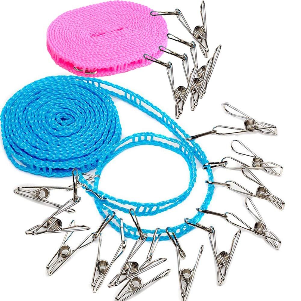 【数量限】AMUU 洗濯ロープ 物干し ロープ 2本入 約5m 16個きんぞくクリップ付き 旅行 ランドリーロープ 防風 乾燥ロープ キャンプ 多用途 携帯便利 室内外用(ブルー、ピンク) | GIGATERA