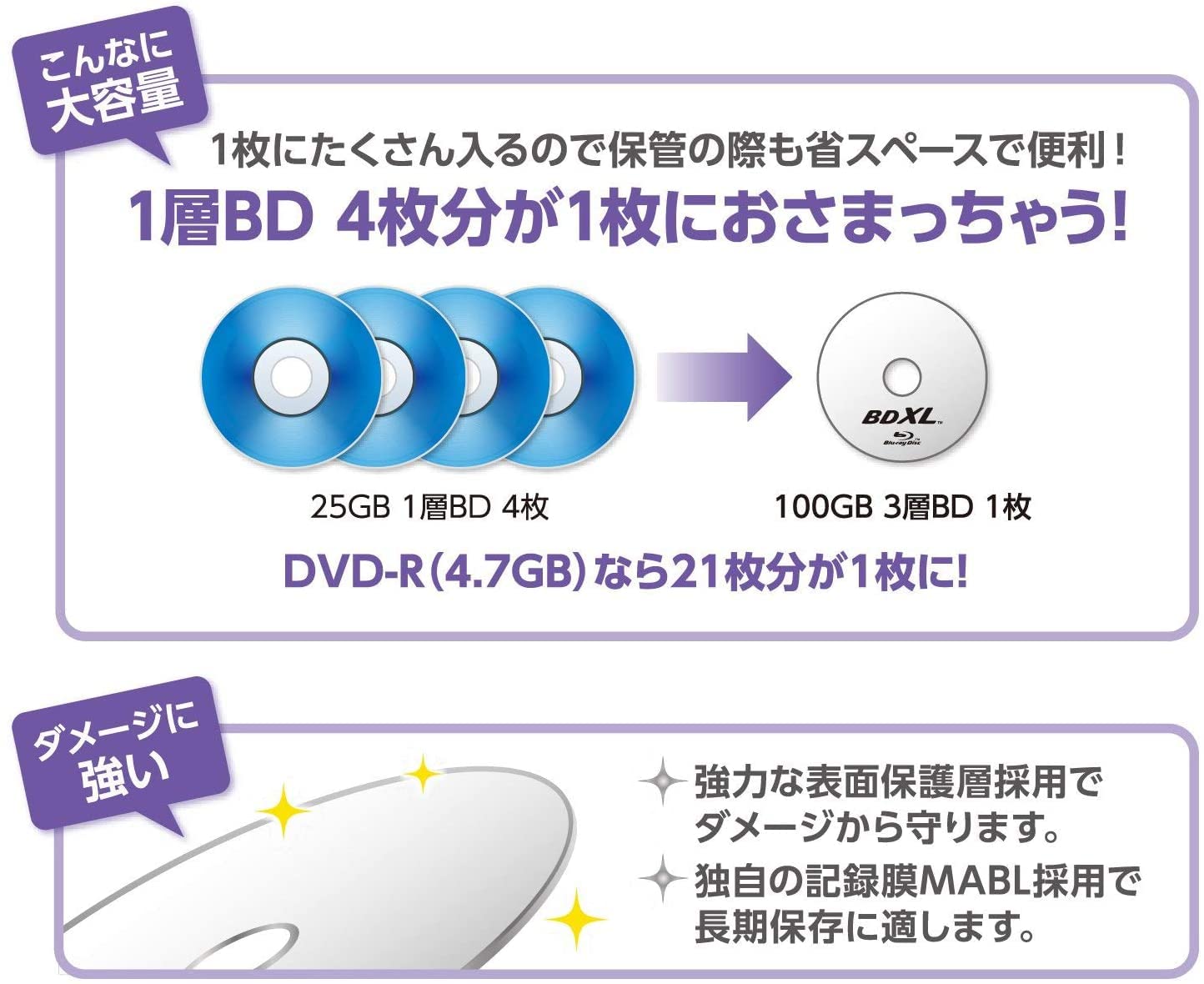 本製品は、BDXL規格に準拠した、容量100GBと大容量の録画用3層ブルーレイディスクです。