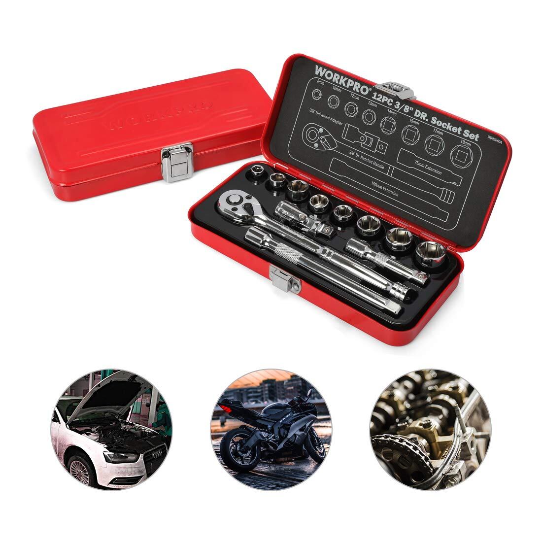 WORKPRO ソケットレンチセット ガレージツールセット ラチェットレンチ 差込角9.5mm(3/8インチ) クイックリリースラチェットハンドル 工具 道具 セット 12点組【鉄製ケース付属】