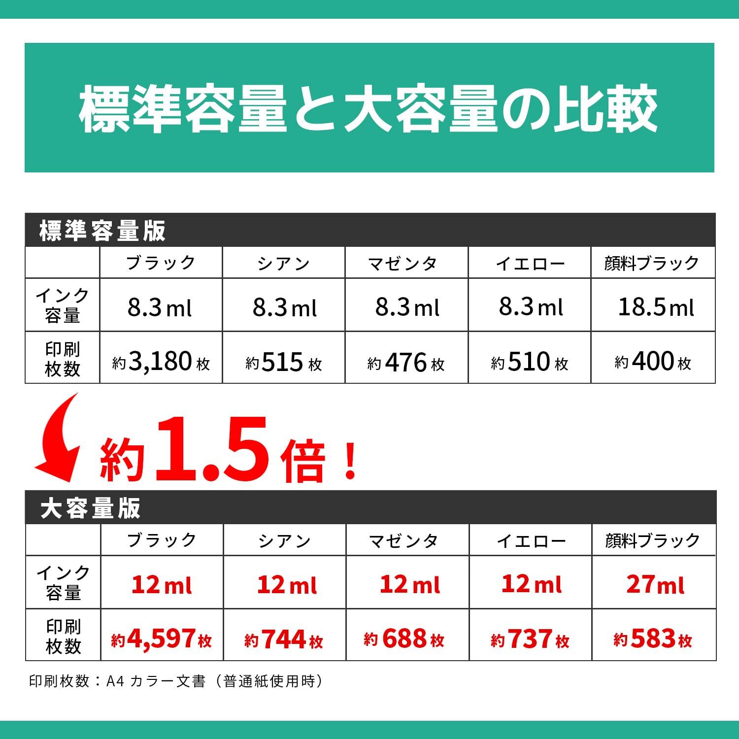 [商品説明] ・本製品は、純正品と同様に使用できる互換インクカートリッジです。純正品ではありません。・インクには、流動性が高く発色の良い「HDカラー」を採用しています。プリントヘッドにやさしく、プリンタの寿命を縮めることはありません。・互換インクとプリンタの相性問題の原因となる「ICチップ」は、業界最大手のAPEX(アペックス)社製の最新バージョンのICチップを採用し、高い安定性を実現しています。・高性能ICチップと高品質インクを採用していますので、純正インクとの併用が可能です。・残量表示にも対応しておりますので、プリンタの設定変更をすることなく、純正品と同様にお使いいただけます。・プリンター故障の原因になるカラ打ちを防止するために、印刷枚数に必要なインクよりも多めにインクが填充されています。そのため、使用後にカートリッジ内にインクが残っている場合がありますが製品不良ではありません。