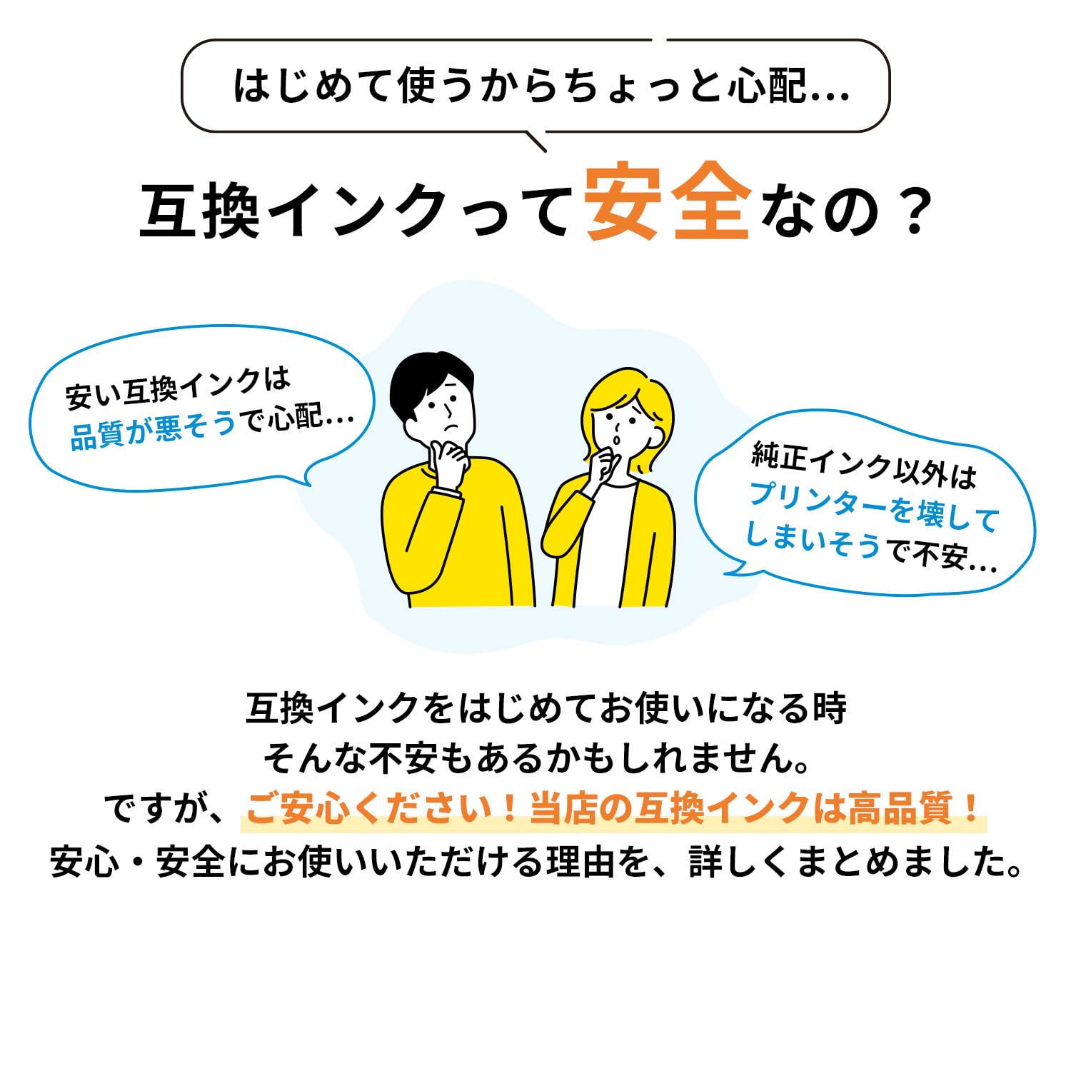 [日本人技術者監修] ・当社熟練の日本人技術者による品質改良・アフターサポートが充実! ・ISO14001、ISO9001を取得した工場で生産された商品です。 ・品質を保持するため、インクはひとつずつ個包装をしております。 ・改善が必要とされる場合は、当社の担当スタッフより海外提携工場と直接やり取りを行っております。連携を密にとり、品質の維持や向上に努めております。・純正インクから互換インクに切り替えた最初のうちは、それぞれのインクが混ざり合う為に印刷にかすれが出ることがあります。その場合は、通常よりも多めにヘッドクリーニングをおこなってください。