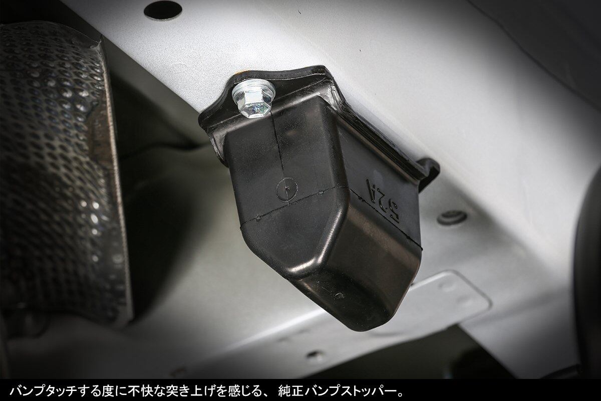 ハイエースが抱える最も深刻な問題が、ローダウンが原因で生じる激しい突き上げです。標準車高から少しでもダウンすると純正ストッパーとのクリアランスが減少し、大きくバンプした際などに強烈な衝撃をうけることになります。しかし、それを避けようとストッパーを外した状態で走行すれば、アクスルキャリアがフロアと激しく接触し、最悪の場合は走行困難な状況に陥ることだってありえるのです。そんなローダウンにまつわる諸々の問題を解決するために必要不可欠なアイテムが“バンプストッパーです。サスペンションの一部として機能させることを前提に開発したこのアイテムには、革新的な2層構造と3次元CADを用いた応力解析によって、衝撃を吸収しながらストロークスピードを抑える特性を与えました。バンプタッチの穏やかな感覚は、乗車時はもちろん積載時にも絶大な効果を発揮するでしょう。