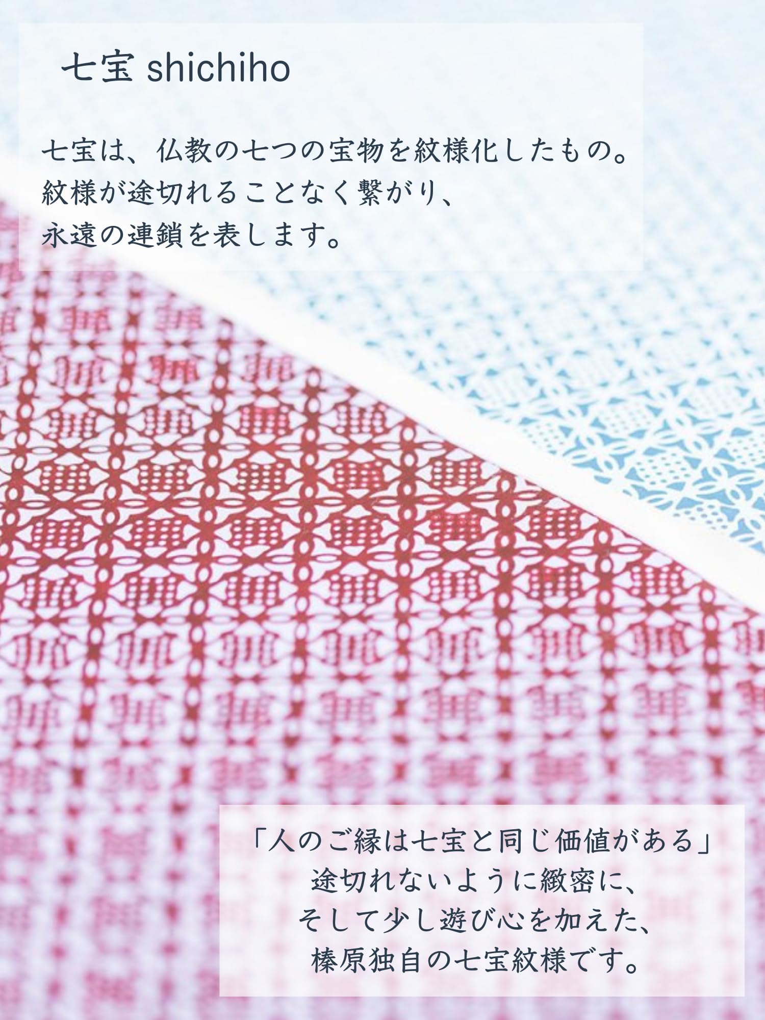 七宝は、仏教の七つの宝物を紋様化したもの。紋様が途切れることなく繋がり、永遠の連鎖を表します。 「人のご縁は七宝と同じ価値がある」 途切れないように緻密に、そして少し遊び心を加えた、榛原独自の七宝紋様です。