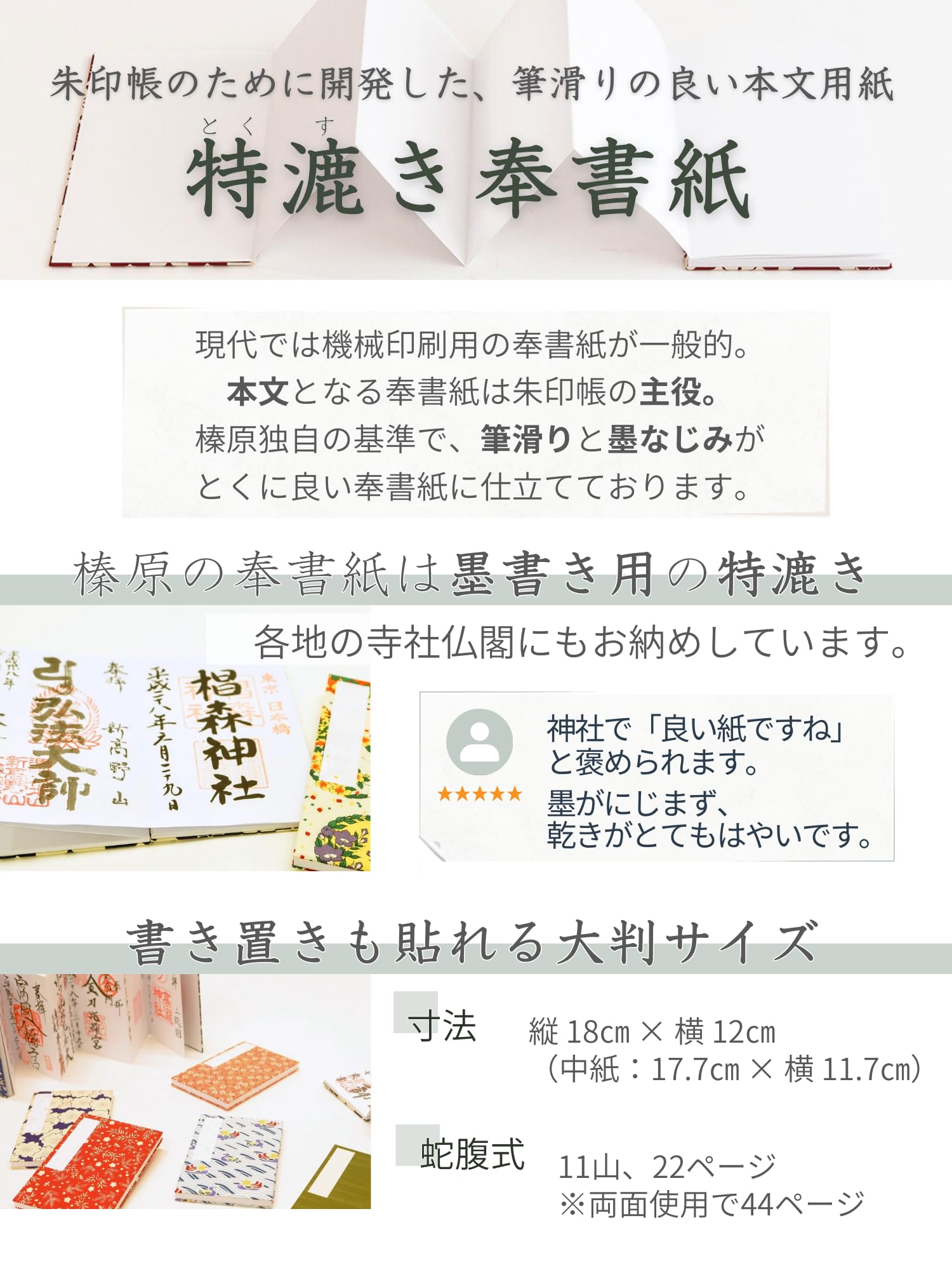中紙は、筆触りの良い特漉き奉書紙を2枚重ねで使用。墨書きに特化した奉書紙で、墨なじみがよく裏うつりしないため、大事な御朱印を長くきれいに残すことができます。製本も1冊ずつ、職人が手仕事で仕立てております。