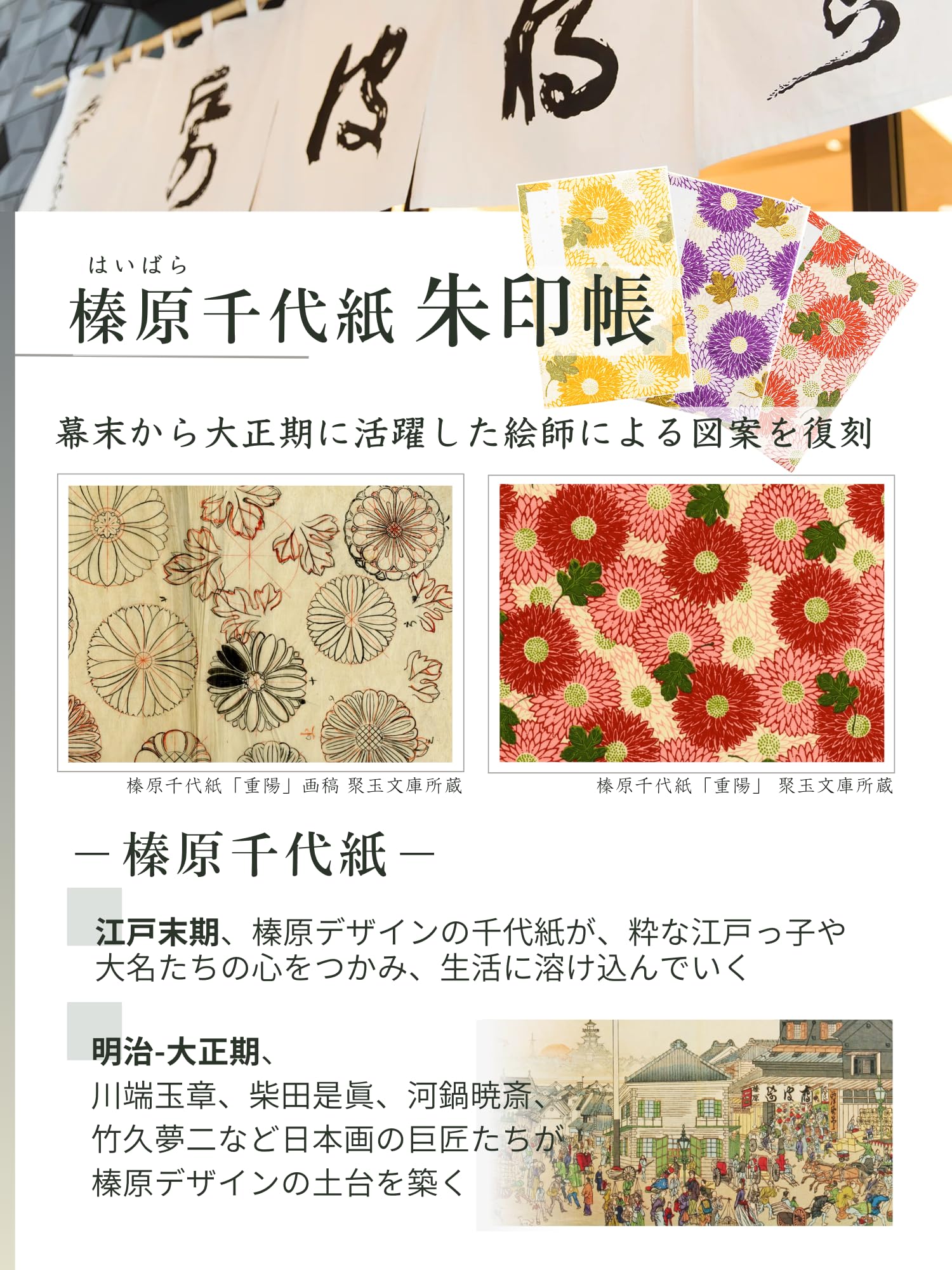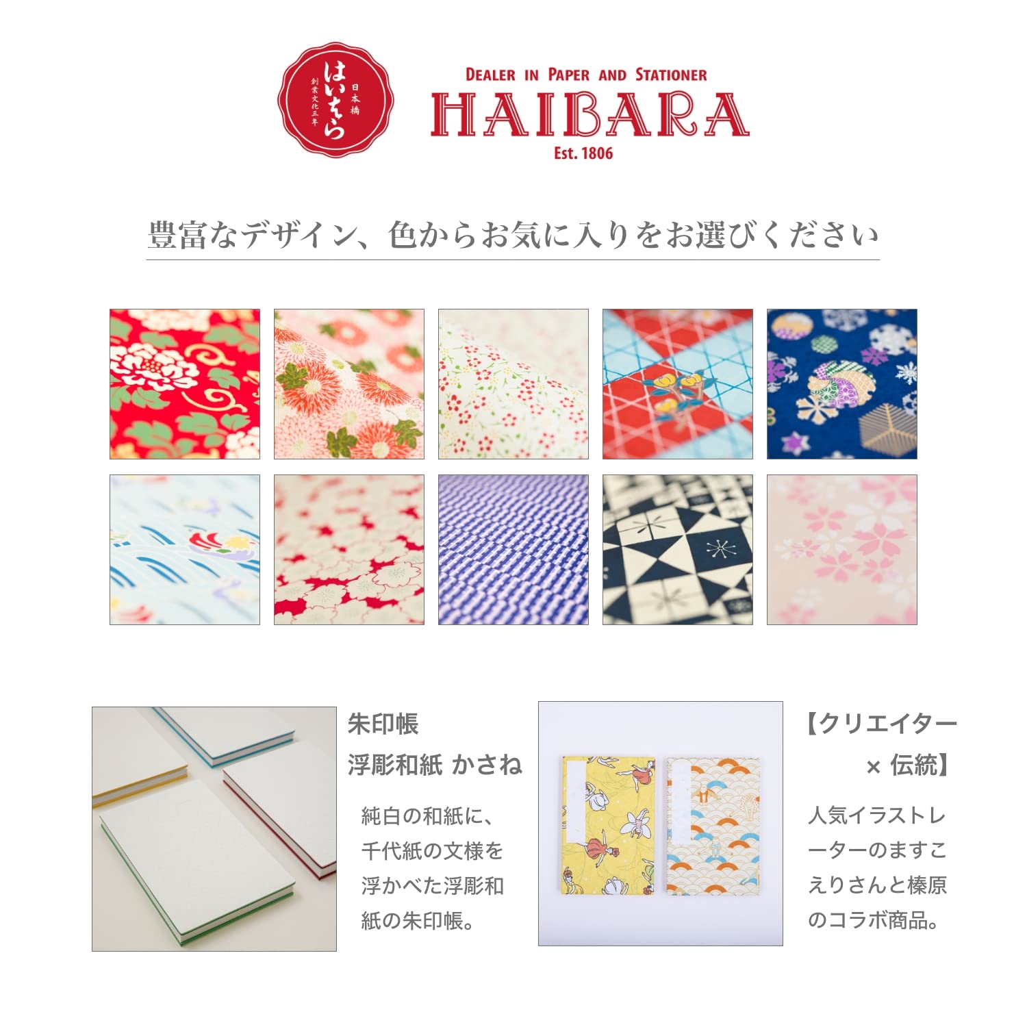 表紙に使用している和柄千代紙は江戸〜大正期の絵師が残した原画をもとに、いまも職人が1枚ずつ、1色ずつ捺染摺り(なっせんずり)の手法による手仕事で摺り上げています。 江戸風の桜柄、可愛い花柄、男性に人気のシックな幾何学模様など、豊富な24の色柄を取り揃えています。