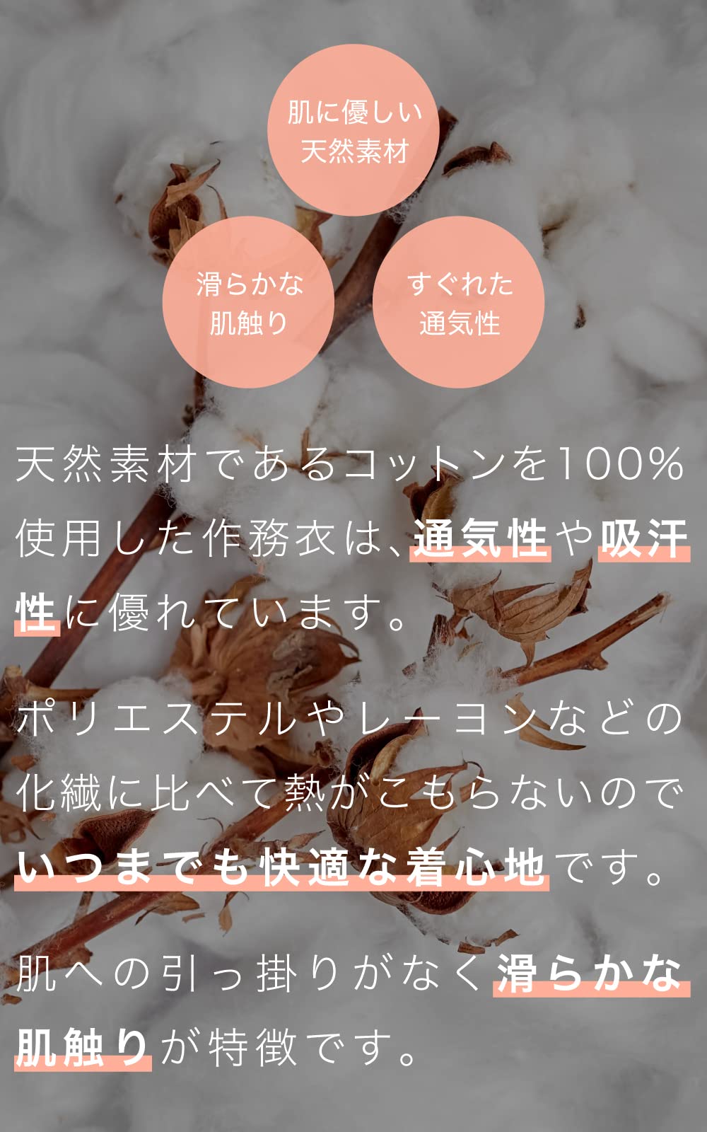 天然素材であるコットンを100%使用した作務衣です。肌への引っ掛りがなく滑らかな肌触りが特徴で、通気性や吸汗性に優れています。ポリエステルやレーヨンなどの化繊に比べて熱がこもらないのでいつまでも快適な着心地が続きます。