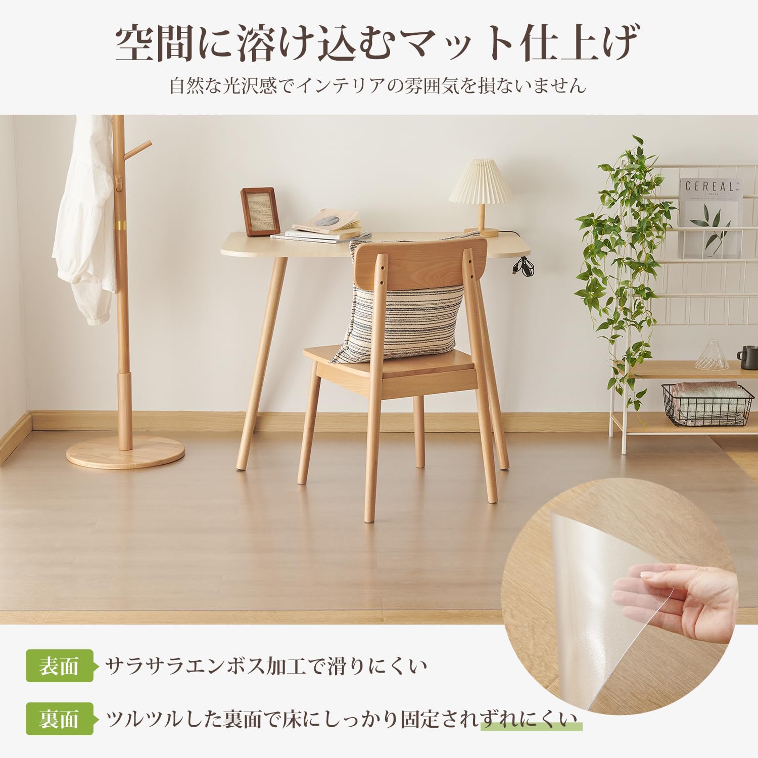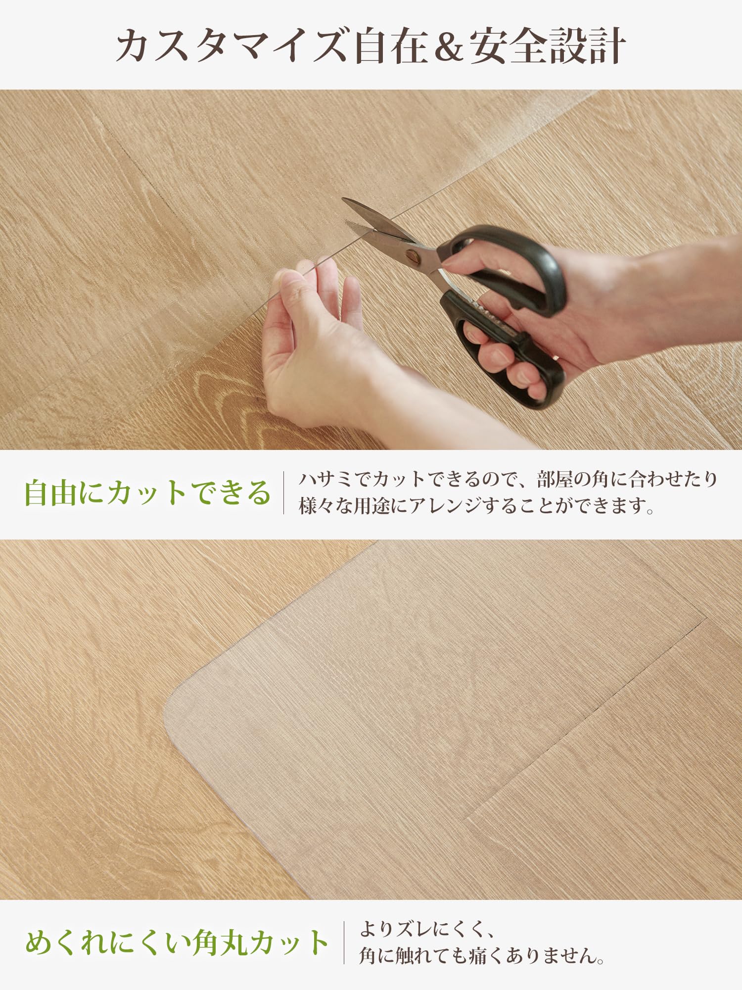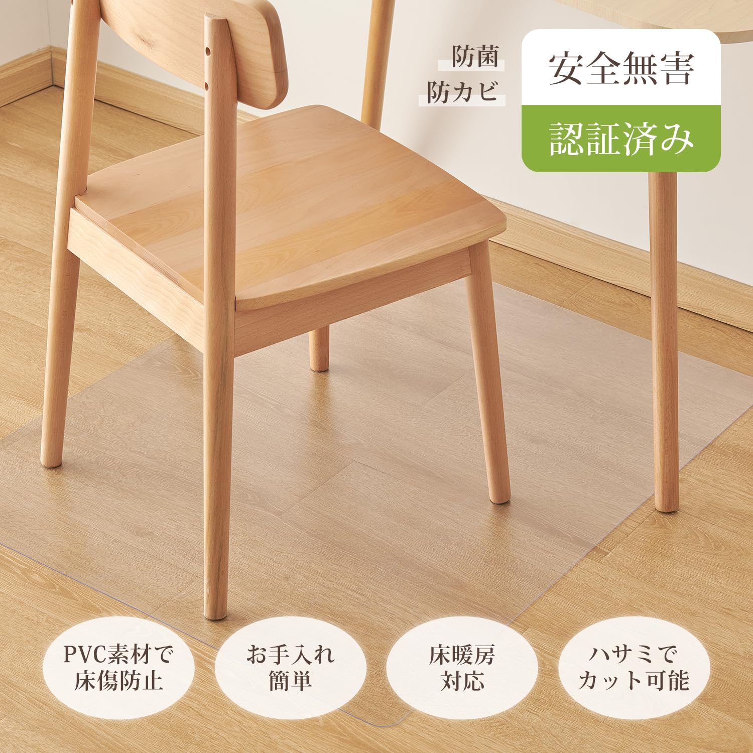 「フローリングを保護」撥水性にすぐれたPVC素材が汚れをはじき、水や汚れからフロアを守ります。抗菌・防カビ加工で常にフローイングを保護します。また、落下物による凹みや、イスの引きずりなどによる床のキズ付きも防ぎます。