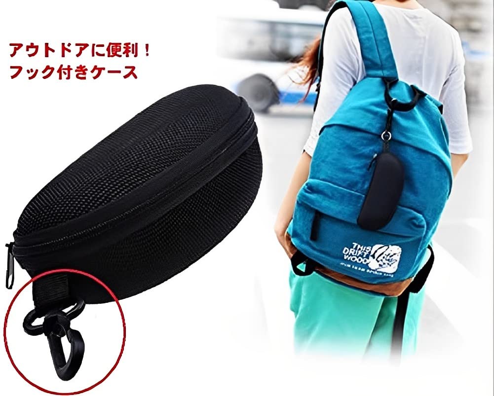 UV400レンズで眼に優しい仕様です。アウトドアやドライブシーンに必須!持ち運びに便利なフック付きセミハードケース付き。