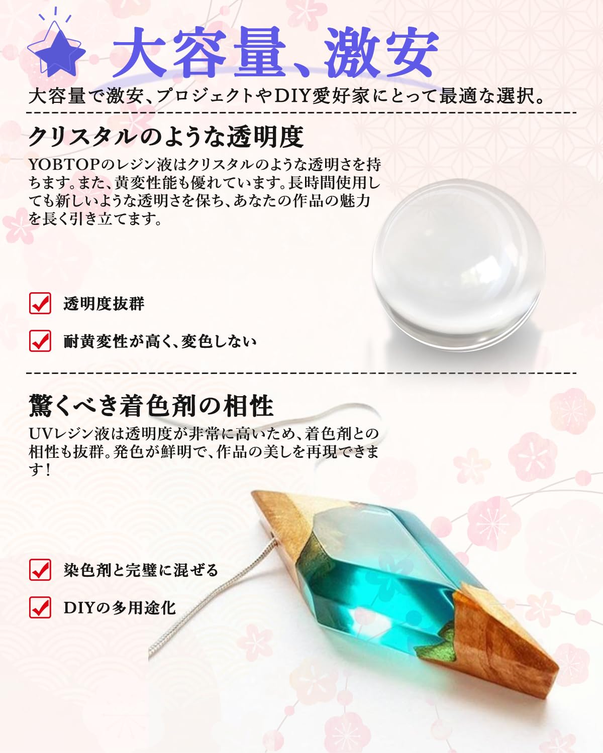 【高品質原料 & 低刺激性】YOBTOPは長年の樹脂生産の経験を持っており、レジンは環境に優しい原料を使用しております、無毒でVOCを含まず、低刺激性で作業中の不快感を大幅軽減。匂いに敏感な方でも安心してご利用いただけます。