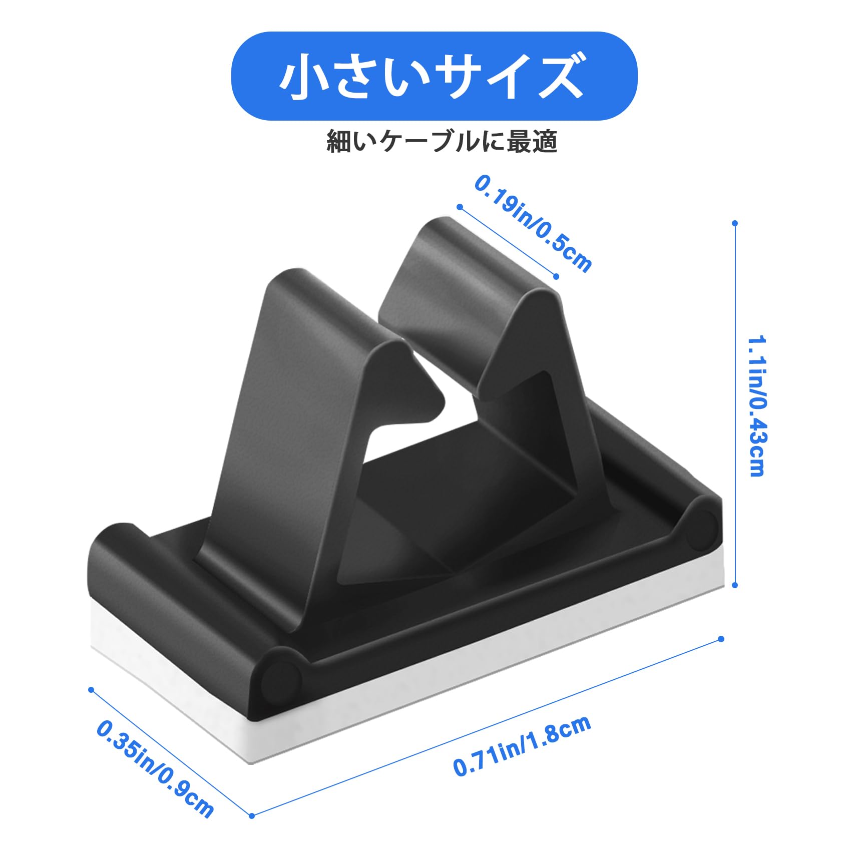 【仕様】内容:50個セット、カラー:黒。幅約1.8cm×縦約0.9cm×高さ約0.43cm、小さいケーブルクリップと言えるが大いな内径があり、丸ケーブル約直径0.8cm以内簡単に装着できます。めちゃくちゃケーブルをきれいに配線させる可能、周りを爽やかになります。*小サイズですから、重すぎるケーブル1本/数本を収納する時に落ちる心配がないように複数の当商品を使用することがおすすめです。