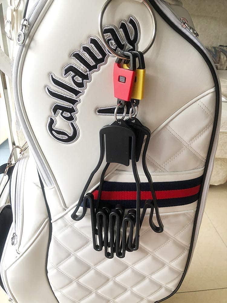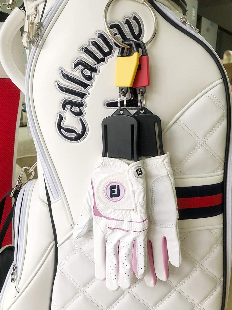 【取り付け・持ち運び便利】プッシュ式のキーフックで着脱は簡単なワンタッチで完成できます。本体はABS樹脂のプラスチックで軽量で、グローブを傷ける心配がありません。金具が付いているため何処へでも掛けれ、負担にならず持ち運びにも便利です。ゴルフバッグなどに吊り下げておしゃれに使いやすいです。