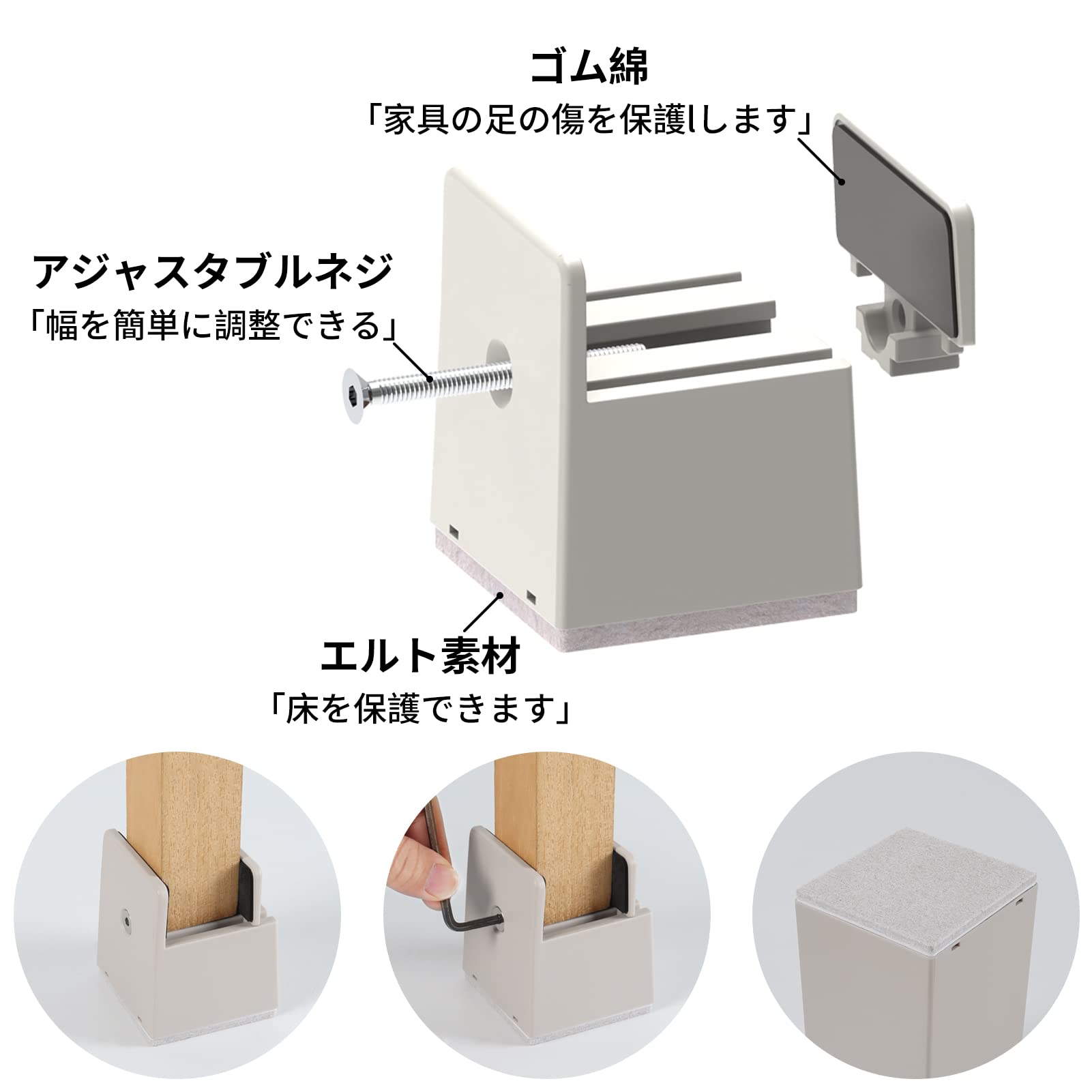 幅を調整できる:適応脚サイズ0~54mmを自由に調整できます。お使いのテーブルやロッカーの幅に応じて最適な位置に調整することができます。幅が調節できるため、しっかりフィットして足パッドを高くすることができ、ベッドやロッカーがより安定します。