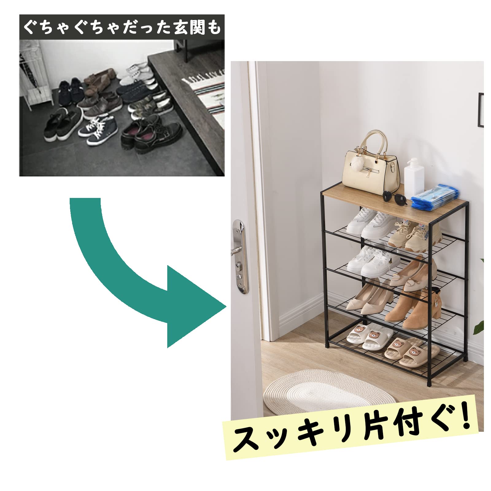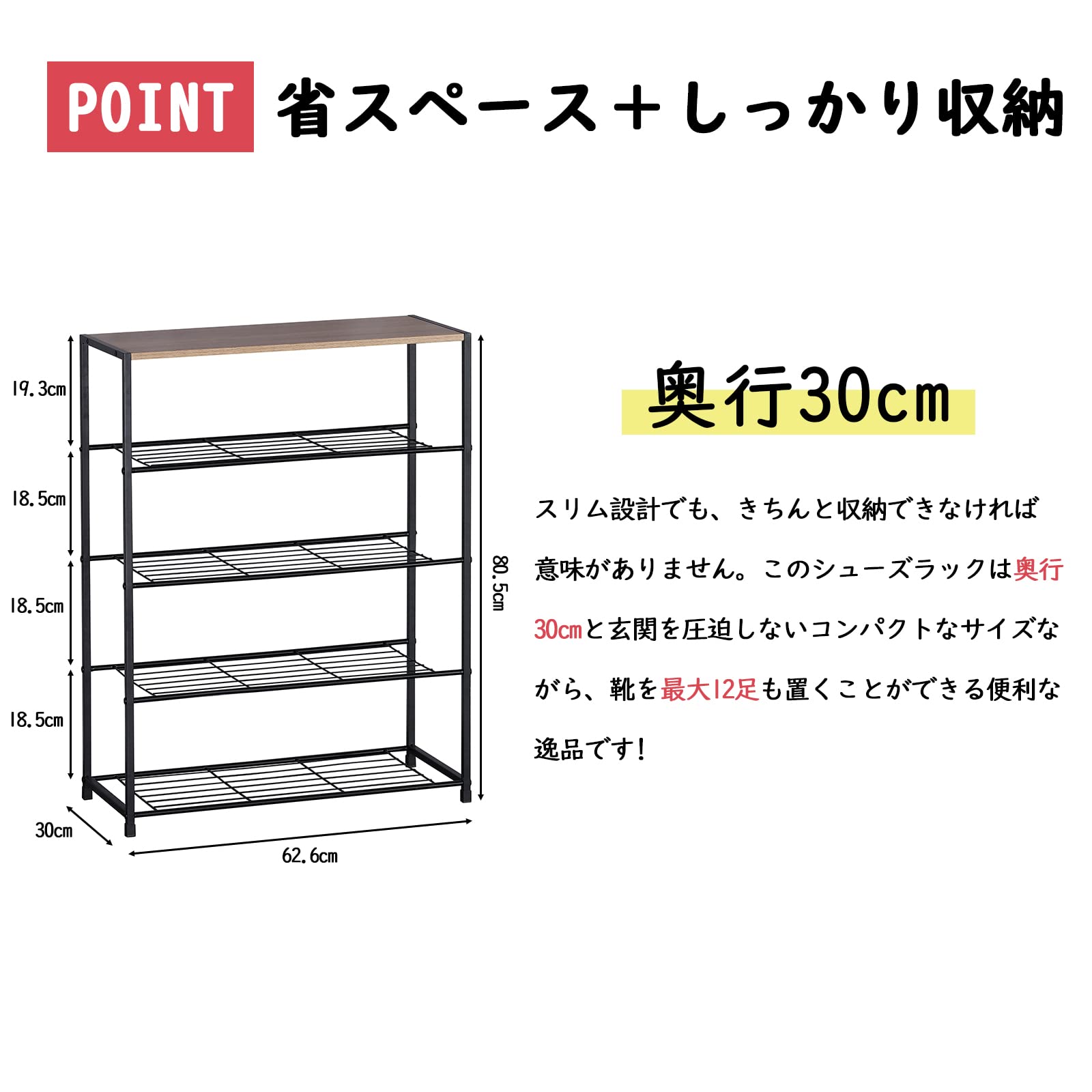 シューズラック 5段 奥行30cm 下駄箱 靴棚 スリッパ棚 玄関ラック メタルメッシュラック スリム 省スペース おしゃれ 木製 木目調 大容量 組立簡単 安定 丈夫 便利 実用 軽量 一台多用 廊下