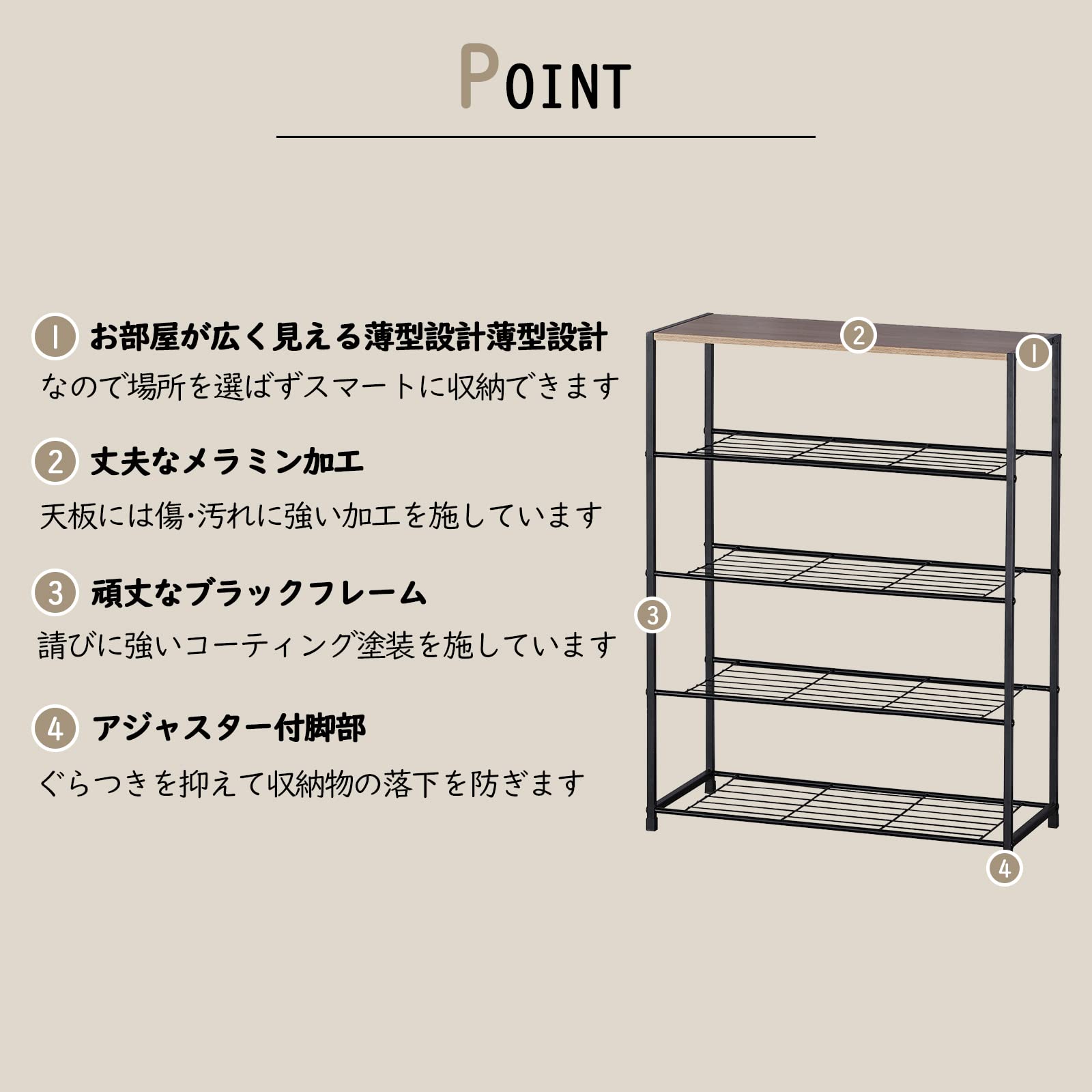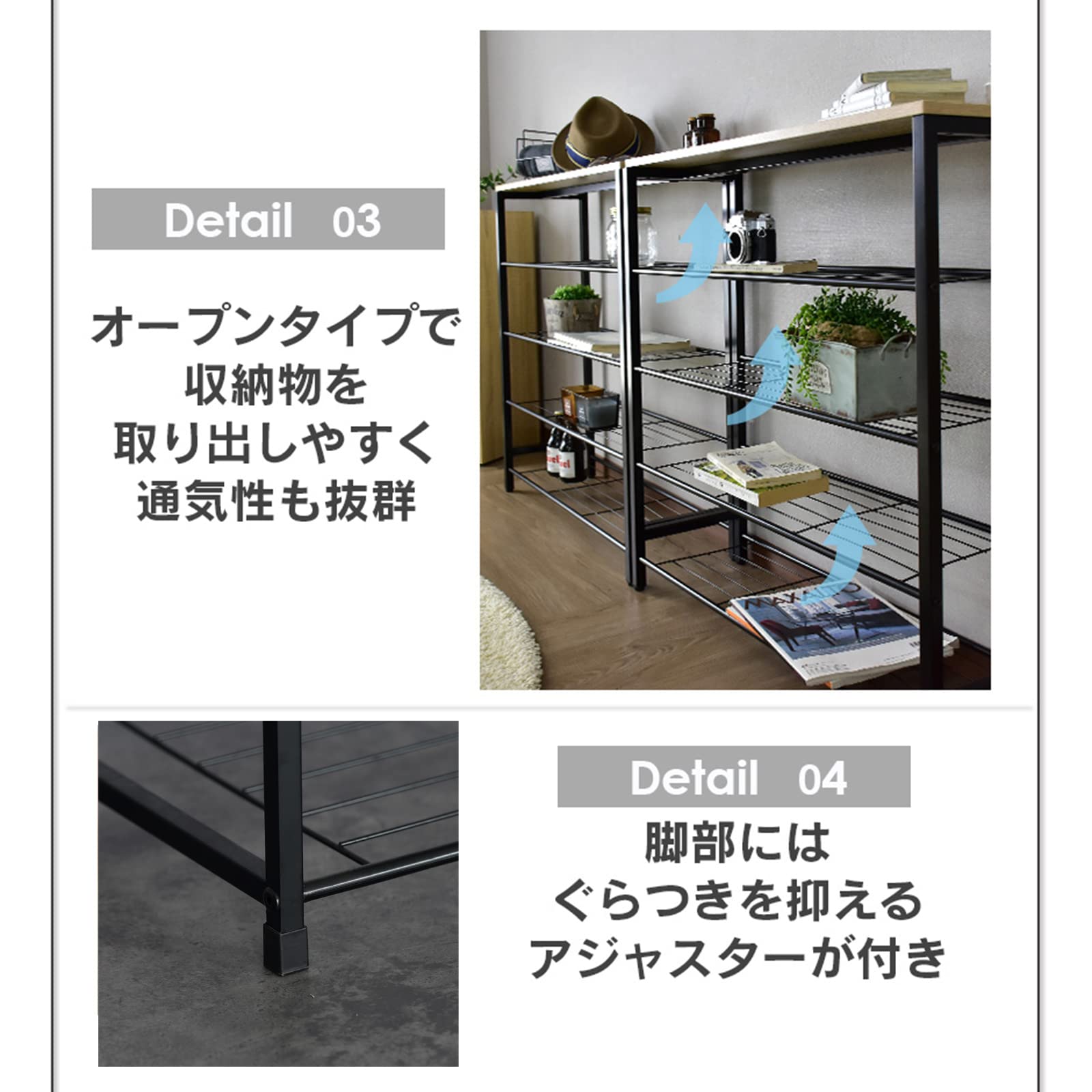 【場所を選ばず大活躍】この軽量収納ラックは薄型設計なので、場所を選ばず、スマートに収納できます。リビングルームに置いた場合、お気に入りの小物や観葉植物を飾ればお部屋の雰囲気もアップ。通気性の良いデザインなのでにおいや湿気もこもりにくく、シューズラックとしてもいいです。さらに、ディスプレイ棚として、空いたスペースを活用してディスプレイを楽しめる。