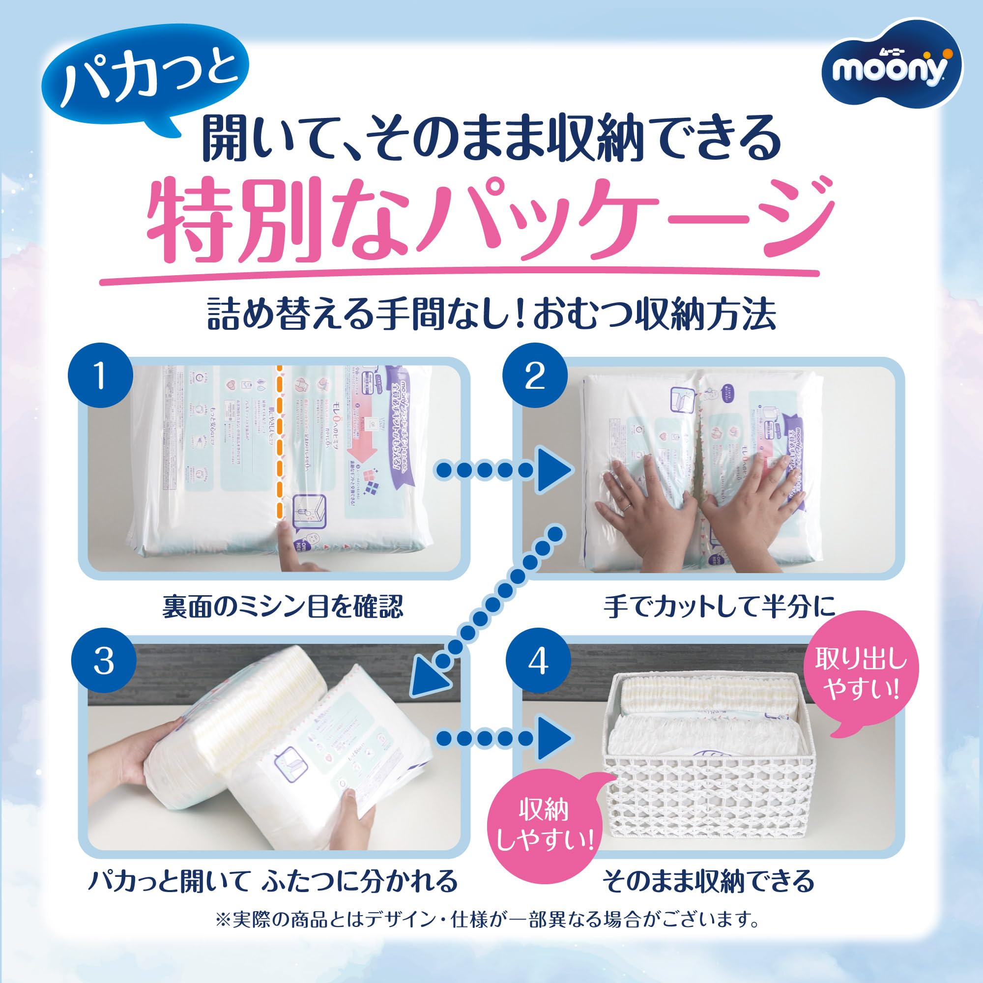 3D設計の「ゆるうんちポケット」で背中モレ0へ! ドドっとうんちもすっぽりキャッチしモレ安心です。また、両脇の「くるっとまとまるテープ」でたっぷりうんちもモレずに、しっかりコンパクトにカンタン後処理できます。さらに、無添加弱酸性トップシートで肌に安心。