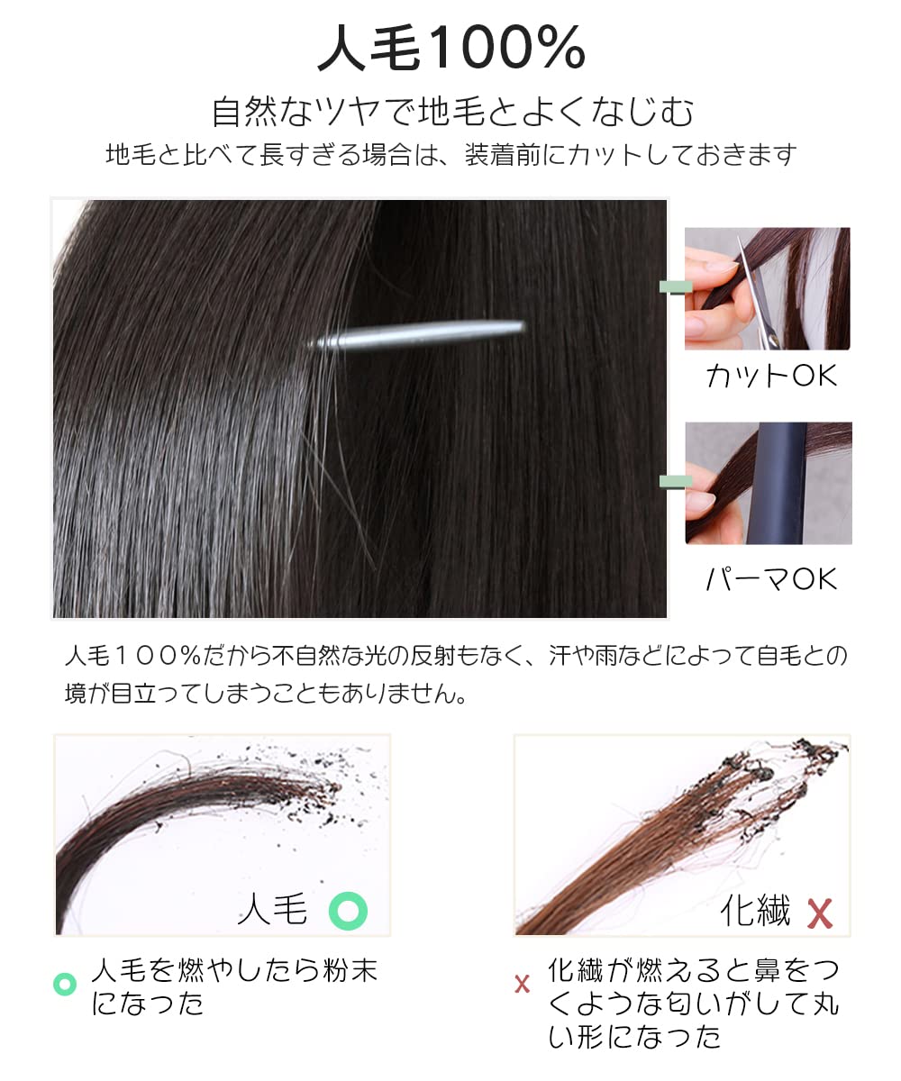 人毛100%:人毛100%だから風合いや手触りが自然、自毛との馴染みがよく、ナチュラルに仕上がるのです。