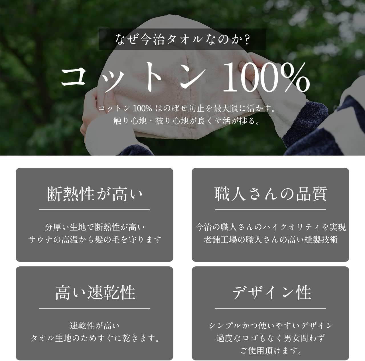 今治タオル で有名なの タオル産地 、愛媛県今治市の ブランド 「 今治 タオル 」 そのマークは、今治タオル工業組合独自の認定基準に合格した品質のタオルであることの証です。 プレゼント にお使いいただいても大変喜ばれます。 メイドインジャパン の サウナハット を是非お試しください。毎日使うものはお肌に優しい物を。 コットン を使用した、ずっと頬ずりしていたくなるようなやさしい肌触りの タオル です。 頭皮や髪のダメージを軽減! 深め デザインで目や耳も熱から守ります。 独自の品質基準をクリアした確かな品質 やさしい肌触りと抜群の 吸水性 のハイクオリティの 今治タオル は、お子様にもお使いいただける 今治サウナハット です