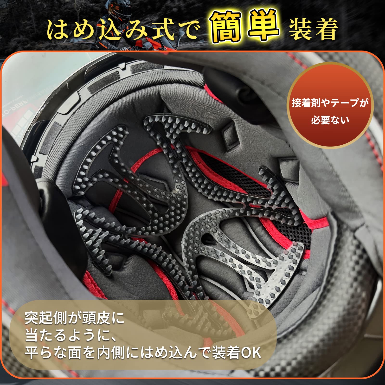 ?【はめ込み式で簡単装着】取り付けに接着剤やテープが必要なく、突起側が頭皮に当たるように、本製品の平らな面をヘルメットの内側にはめ込んでください。その際、穴がより大きい部分が後頭部に位置するように向きを合わせてください。取り外す際は、そのままヘルメットから剥がしてください。装着時のストレスを軽減し、快適にお過ごしいただけます。基本的にどんなヘルメットにも装着可能です。サイクリングや通勤にはもちろん作業用ヘルメットなど長時間着用する際に大活躍します。
