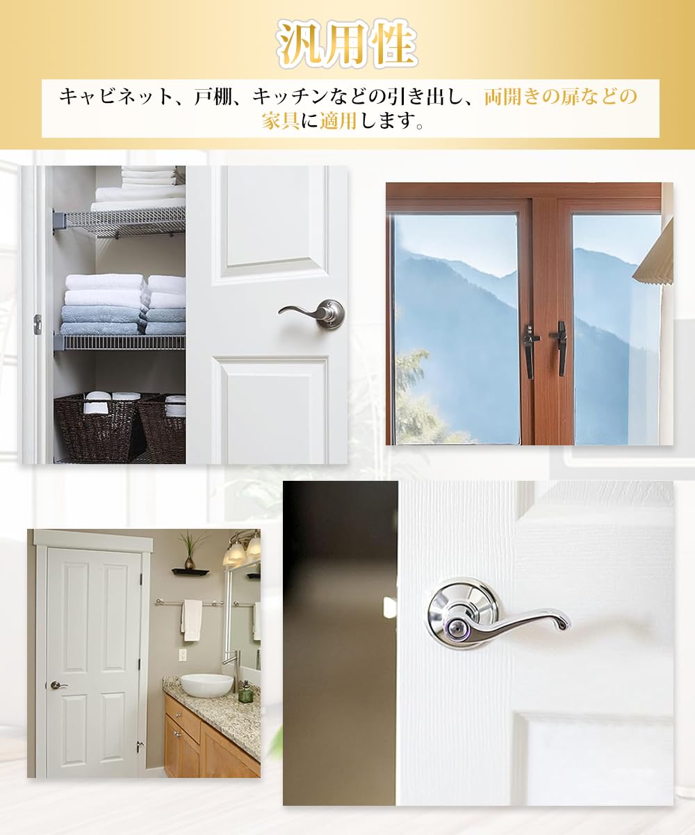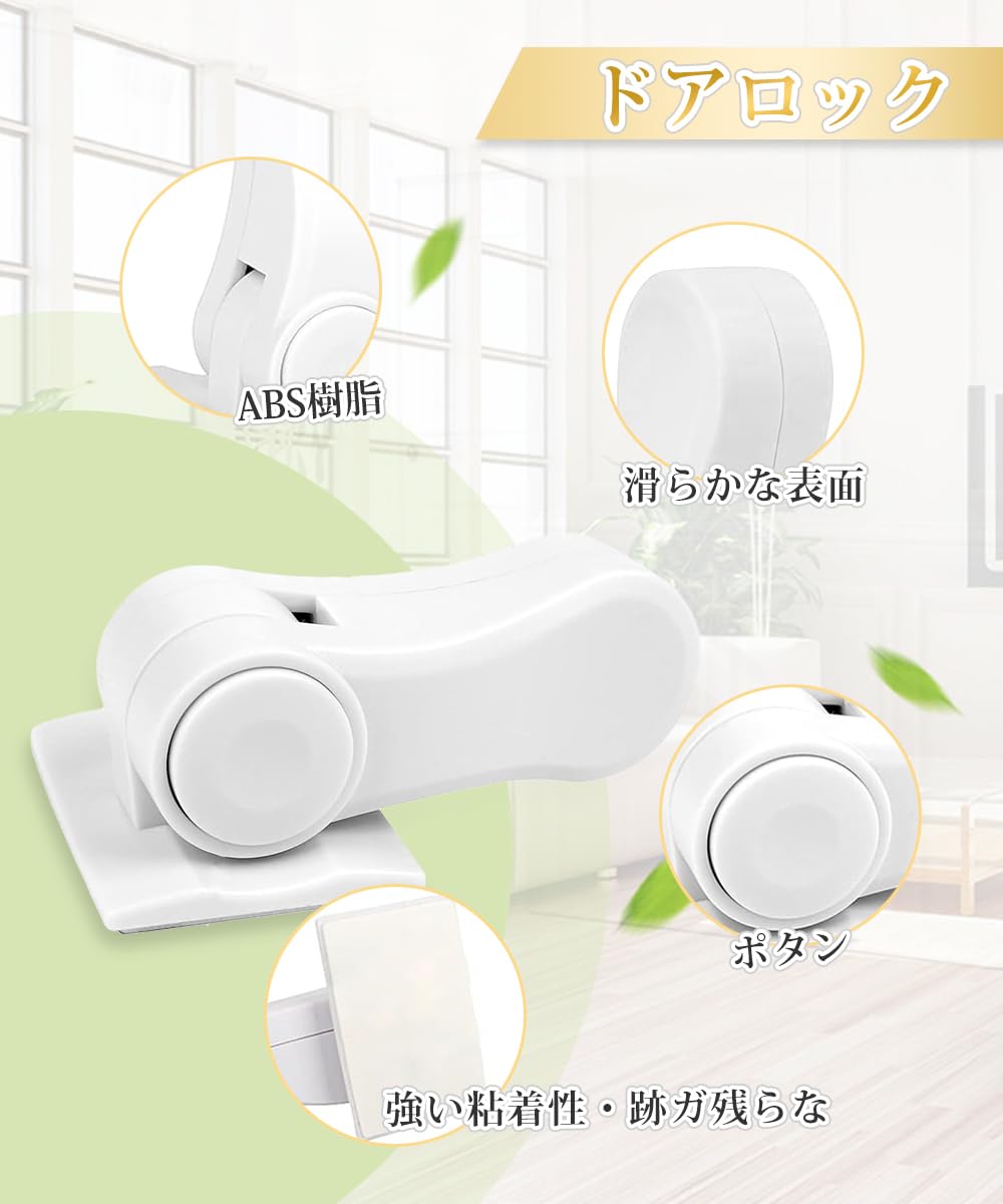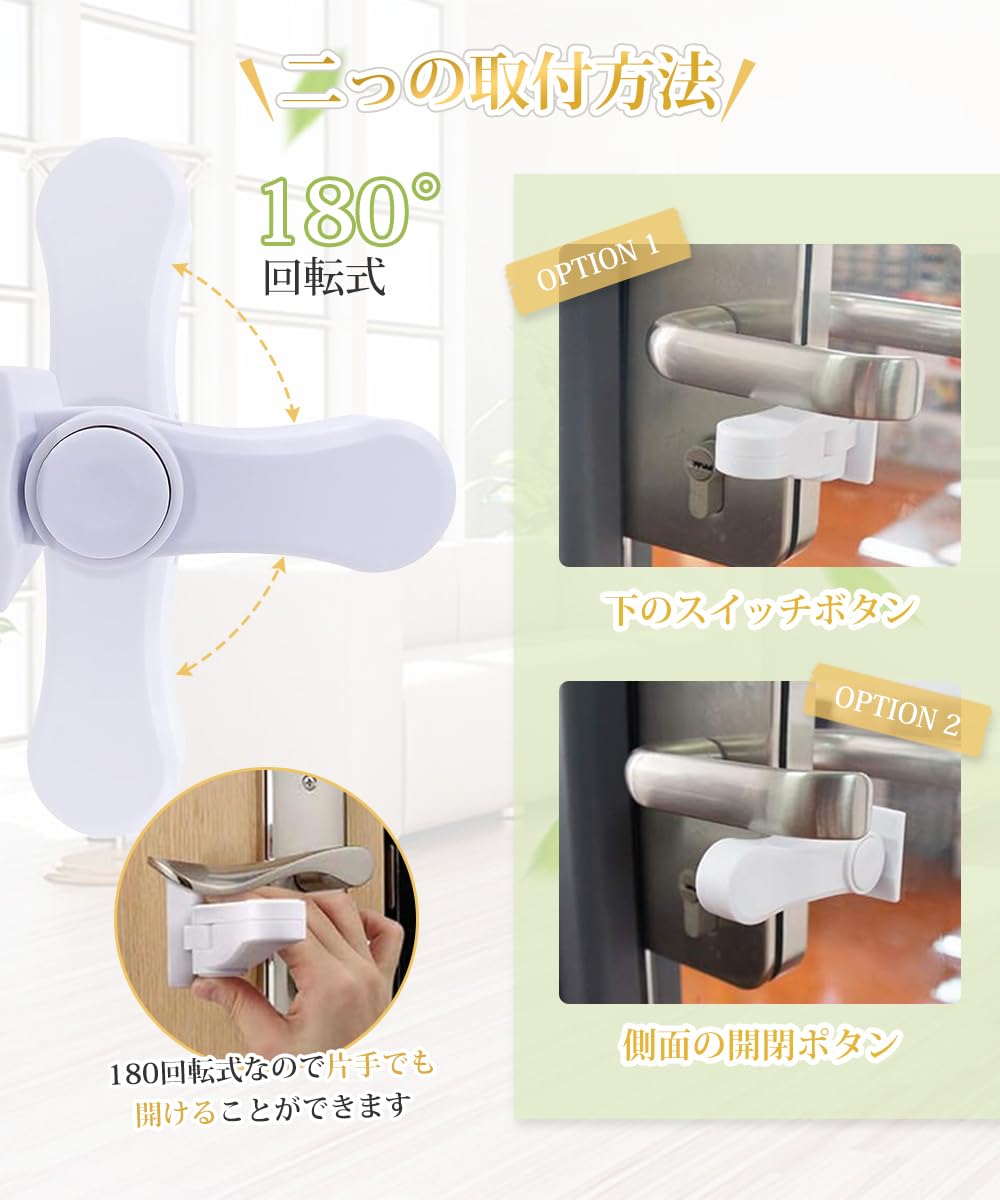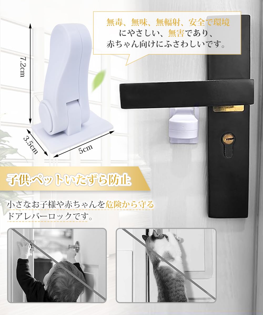 1.子供・ペットいたずら防止:小さなお子様や赤ちゃんを危険から守るドアレバーロックです。引き出し・扉などをロック解除しないと開かないようにすることで、子供たちが指をはさんでしまうことを防止したり、部屋の外に出ていかないようにしたり、様々な危険を防止できます。