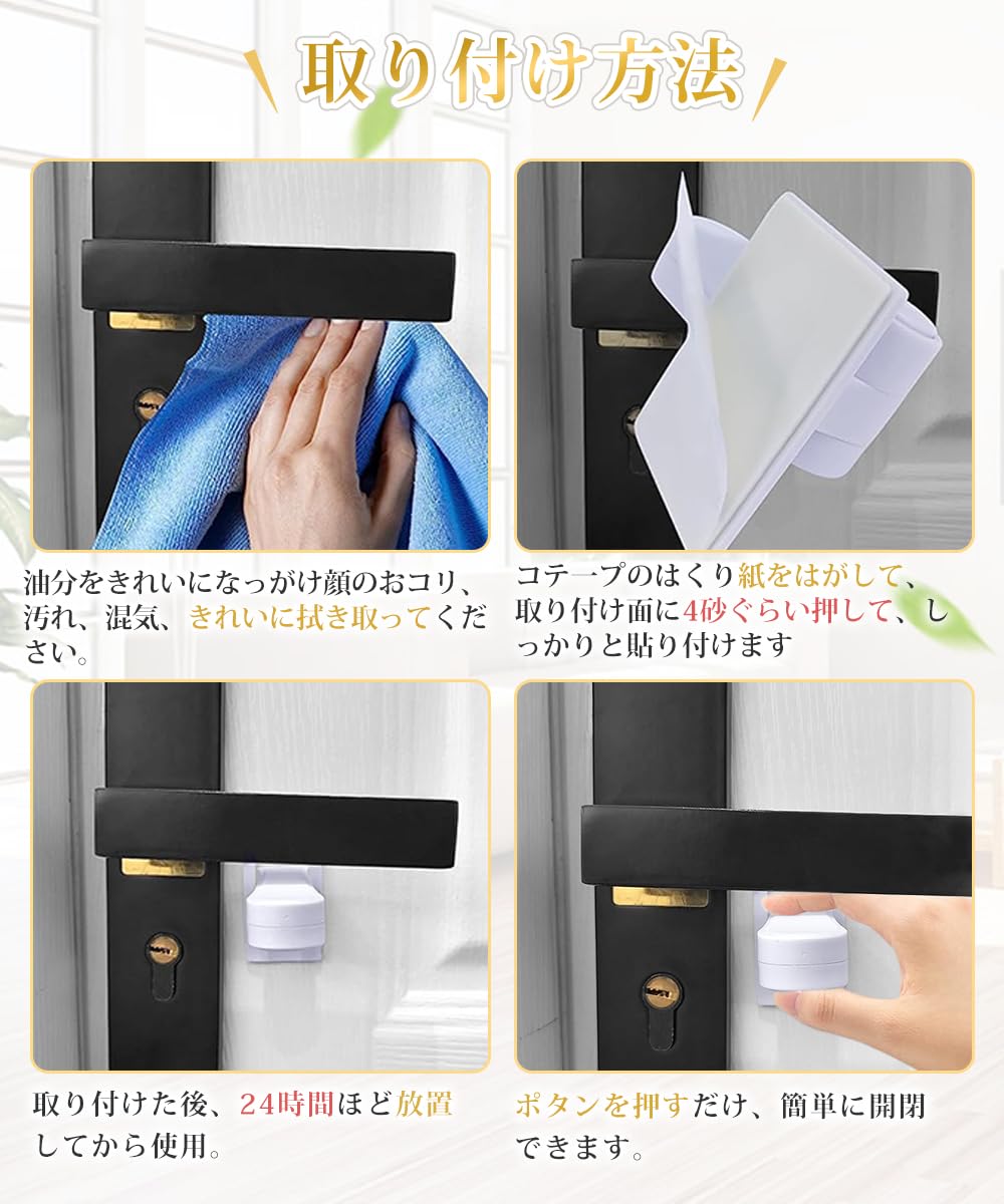 4.取付けも簡単:ネジなどを使用せずに、強力粘着テープで貼るだけの楽々設置。ドアなども全く傷つけません。開閉作業も大人であればワンタッチで簡単に行えます。