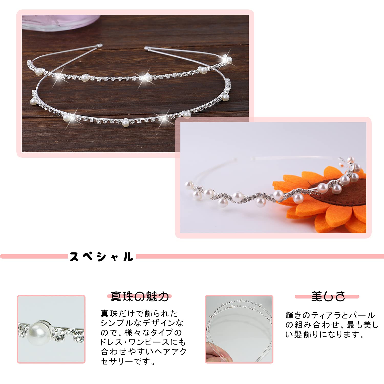 パッケージ内容:カチューシャ2本セットです。ティアラとパールの組み合わせ、キラキラで美しいです。