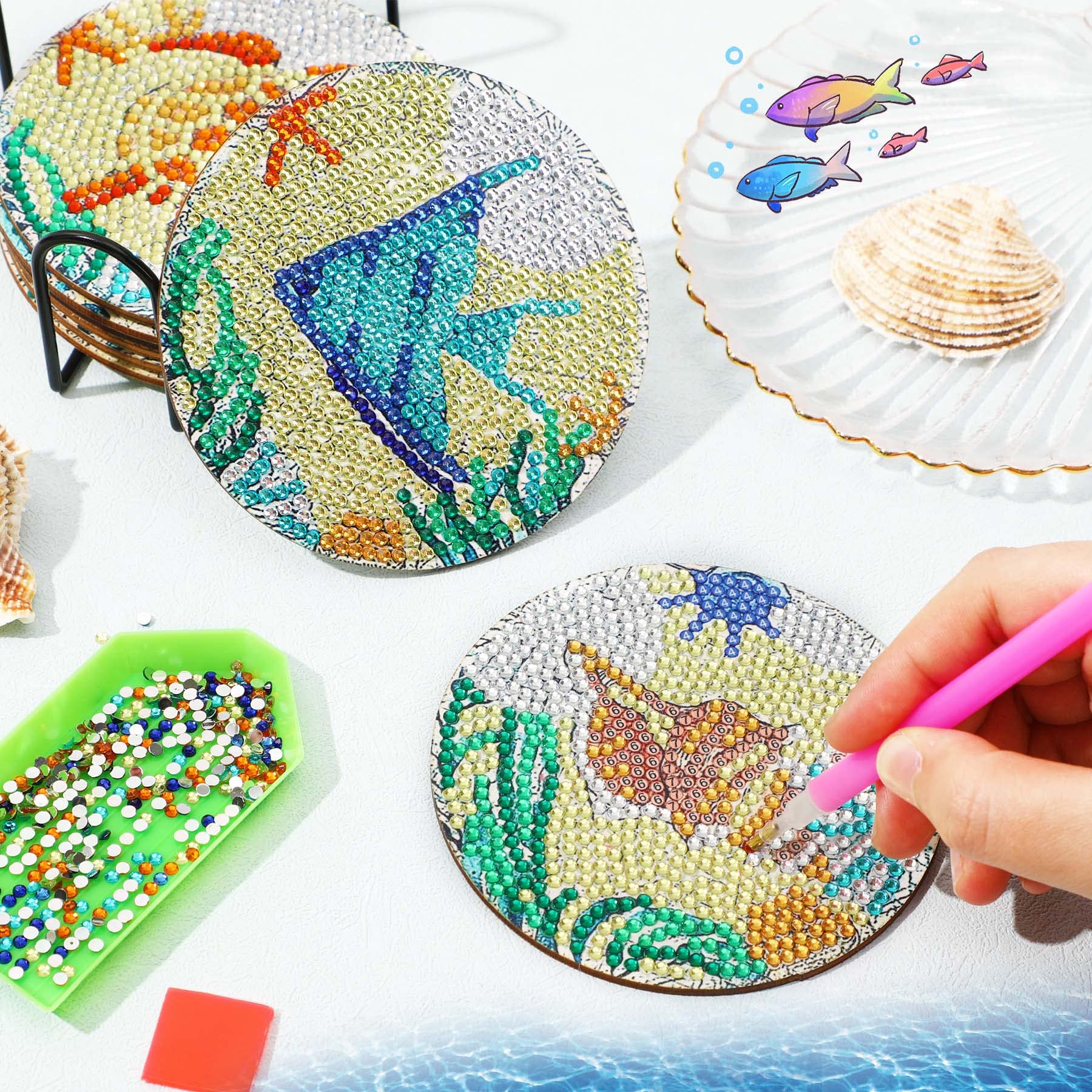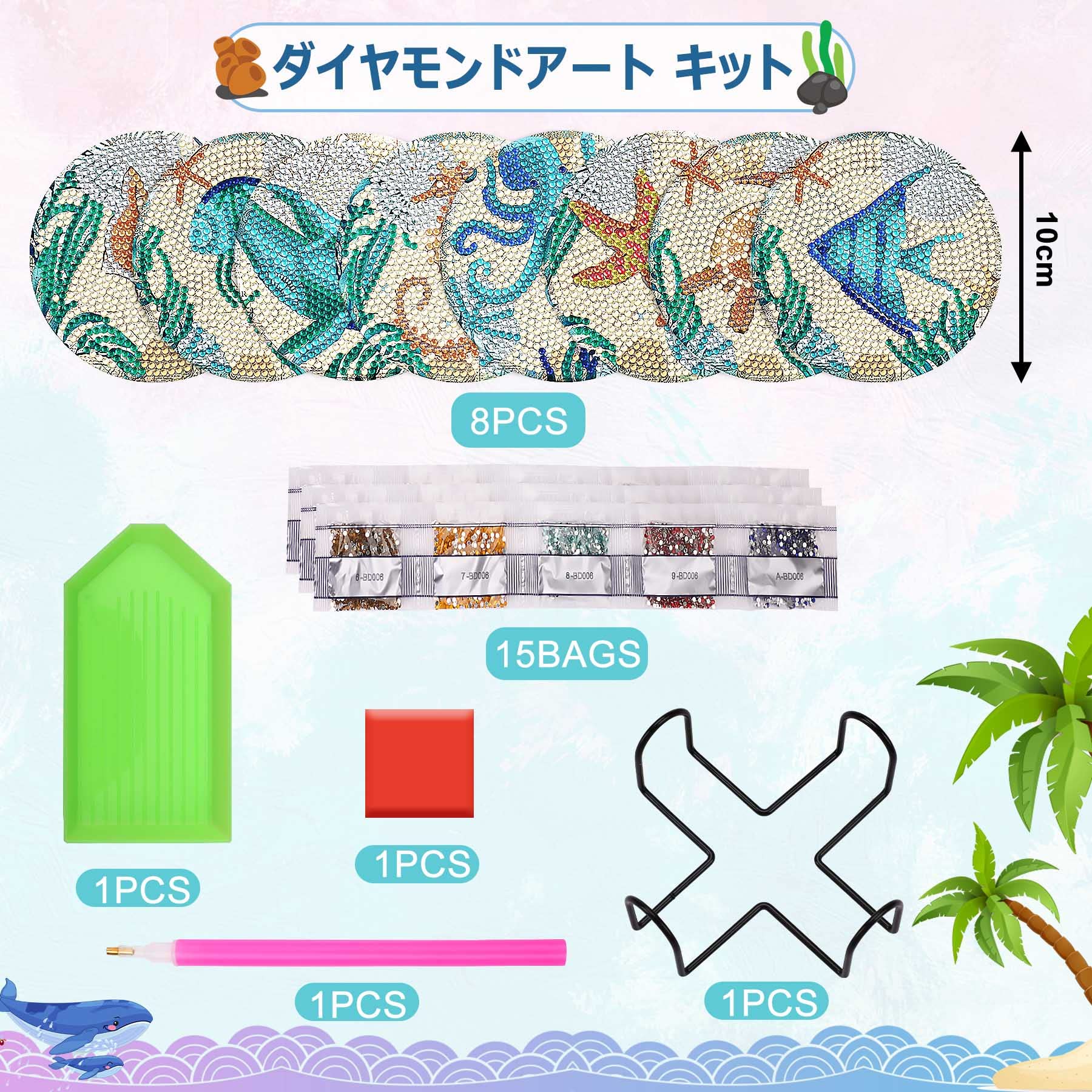 【セール】JANLOFO ダイヤモンドアート コースター コルク ダイヤモンドアート キット 初心者 ダイヤモンドペインティング 8枚 手作りキット 簡単 DIY ダイアモンドビーズ 初心者 ホルダー付き アートクラフト 工芸品 丸型 海の生き物 | GIGATERA