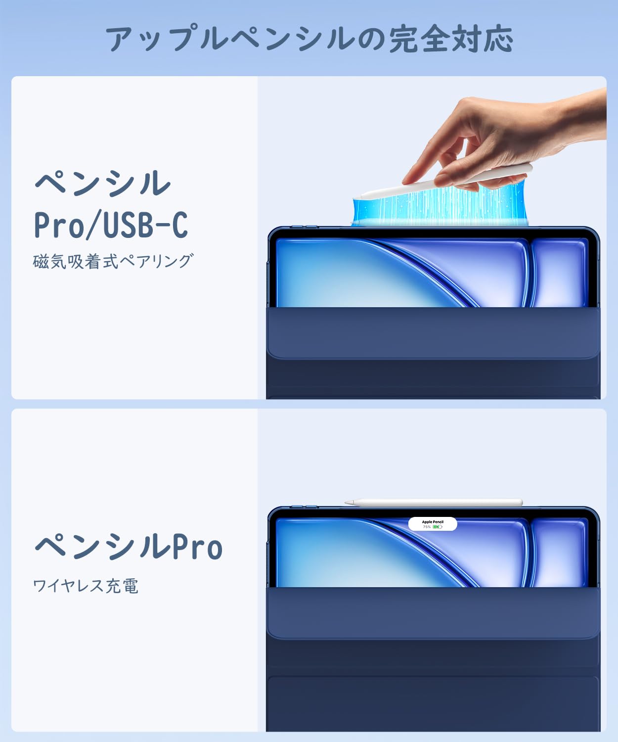 「脱着しやすい」 TPU製のバックケースは簡単に脱着でき、専用設計のため、ケースを装着したまま電源ボタン、音量ボタン、カメラ、充電等すべての機能にスムーズにアクセスできます。ApplePencil USB-Cの磁気吸着及びApplePencil Proのワイヤレス充電に対応できます。