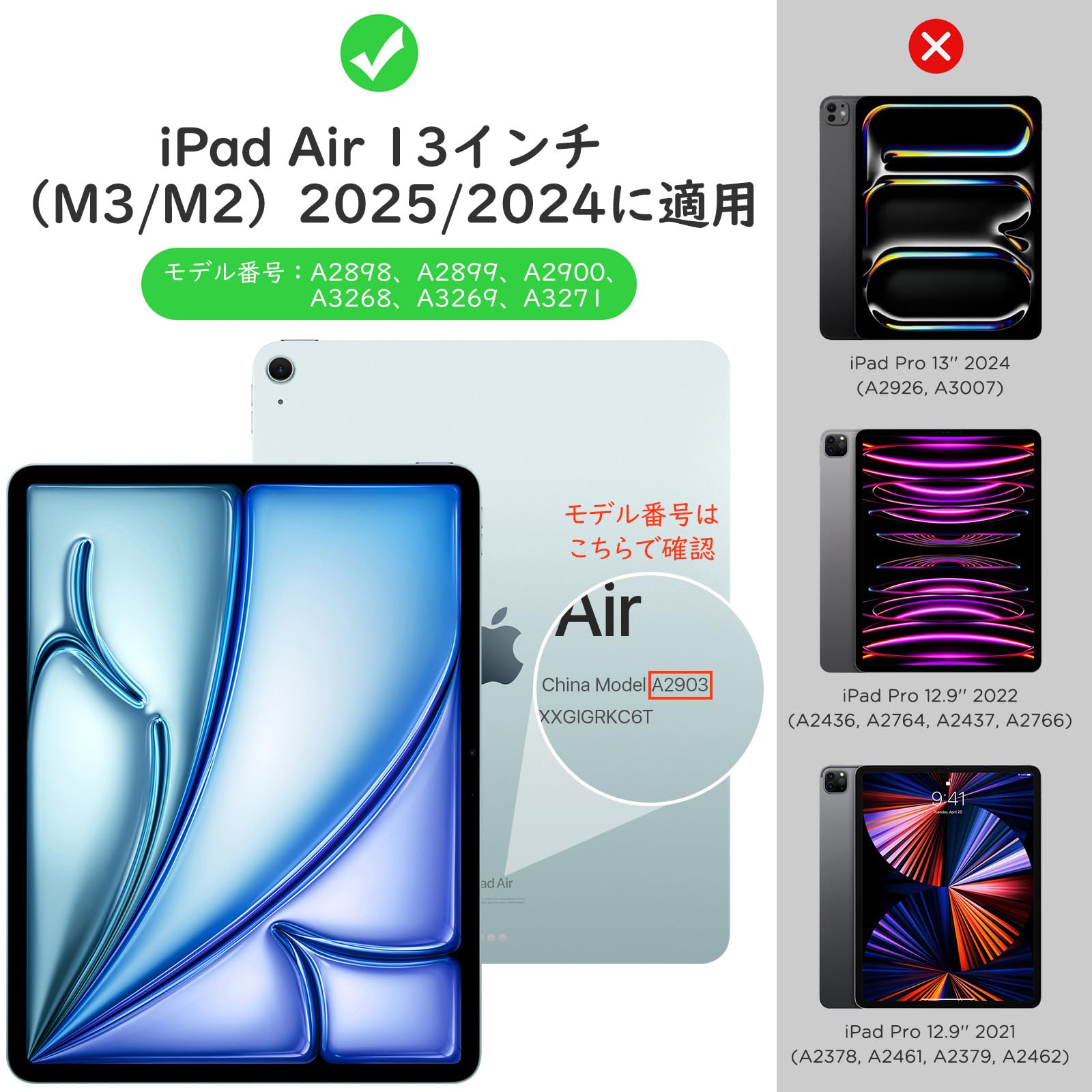 「対応機種」 2025年発売のiPad Air 13インチ(M3)(モデル番号:A3268、A3269、A3271)及び2024年発売のiPad Air 13インチ(M2)(モデル番号:A2898、A2899、A2900)向けの専用デザインです。ご購入前に、機種・モデル番号をご確認ください。ご注意:モデル番号の確認は端末本体の背面カバーにチェックしてください。