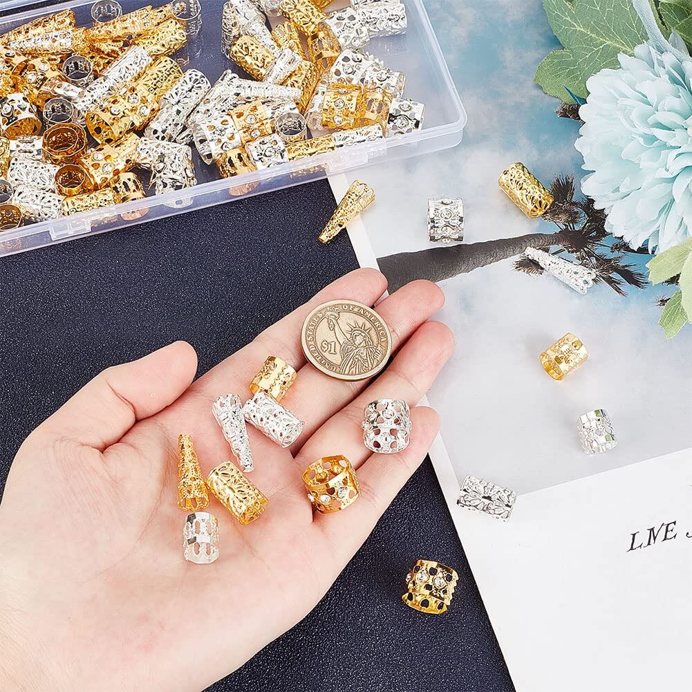 【特価在庫】PH PandaHall 112個 ヘアアクセサリー 4種 ヘアリン グ 髪ビーズ ヘア編組 髪編み リング ドレッド ヘア金具 髪飾り DIY アクセサリーパーツ ダイヤモンドをセットしたデザイン DIY用 手芸材料 手作り素材 シルバー ゴールド | GIGATERA